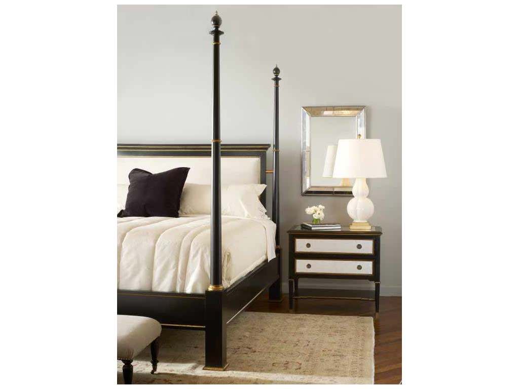 Product Description: Century Furniture MN5535 Barrington Nightstand - This Regency styled Nightstand is constructed of Acacia solids and cherry veneers finished in a slightly distressed antique black with hand applied gold accents. The top and drawer fronts are inset with eglomise glass panels. Two drawers allow for ample bedside storage.