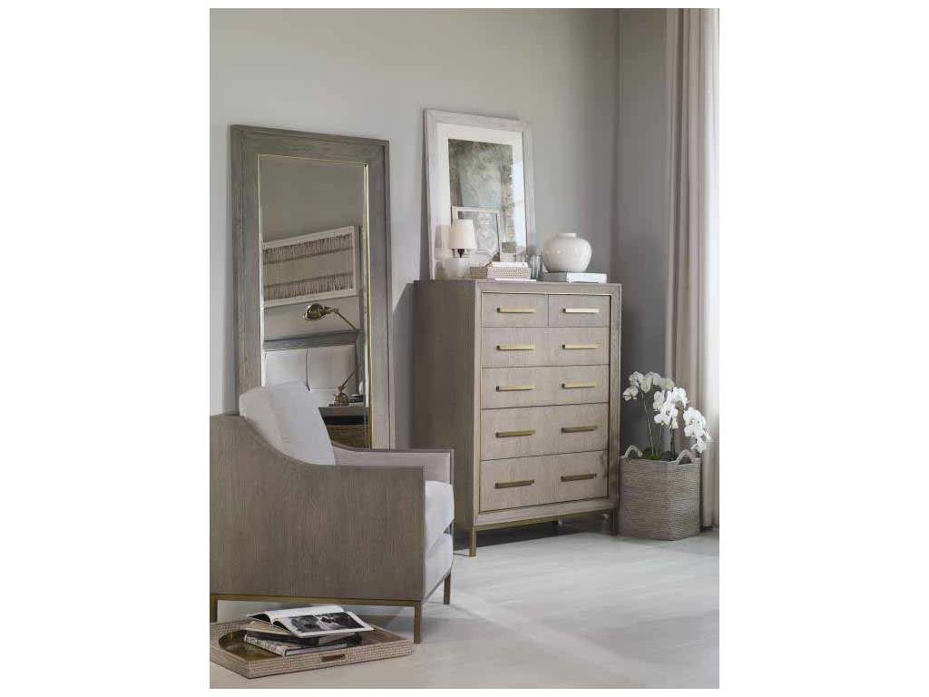 Product Description: Century Furniture MN5754 Monarch Tall Chest - Our Kendall series reflects today's casual contemporary lifestyle. Its understated, clean line forms, linear oak grain and soft gray finish offer a calming and welcoming vibe. Design features include straight grain oak doors and drawers, deep beveled picture framed cases, satin brass finished metal trim and decorative hardware and a plinth base. Each item is crafted of lightly wire brushed oak solids and veneers finished in a warm Camino gray stain. Two smaller drawers and four large drawers all rest on a satin gold finished metal base.