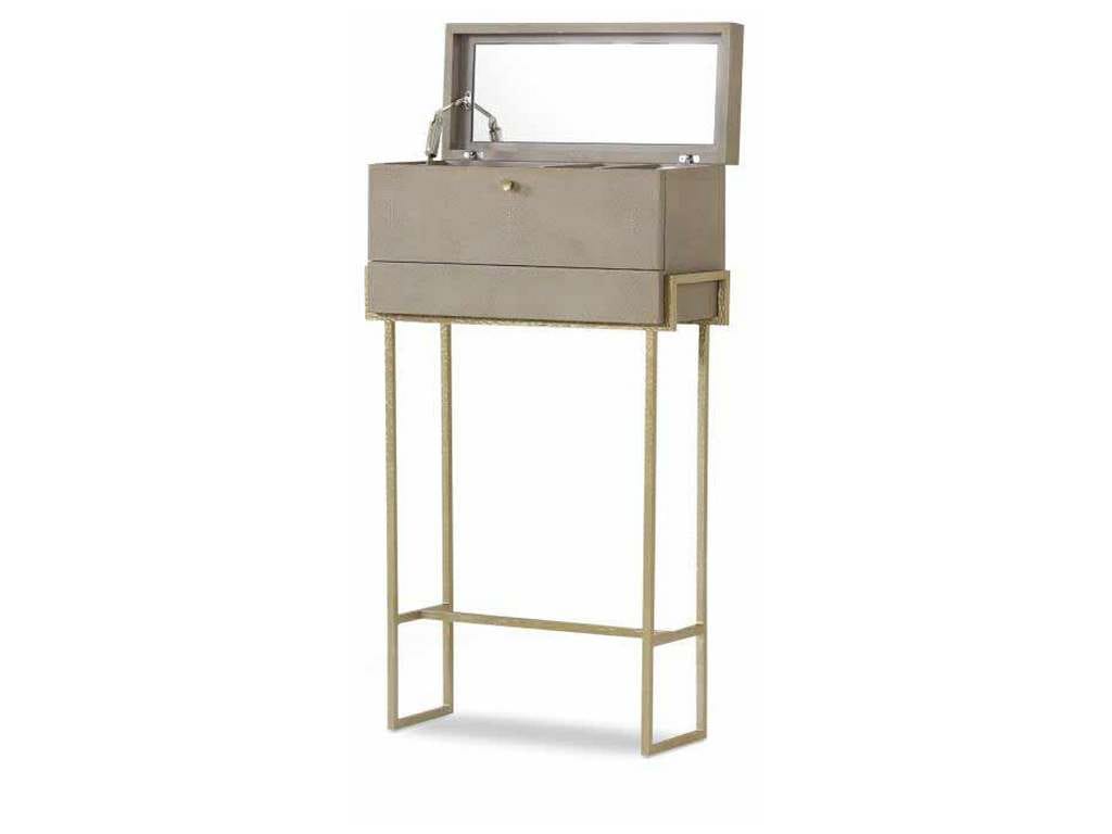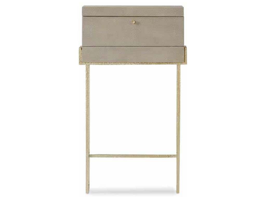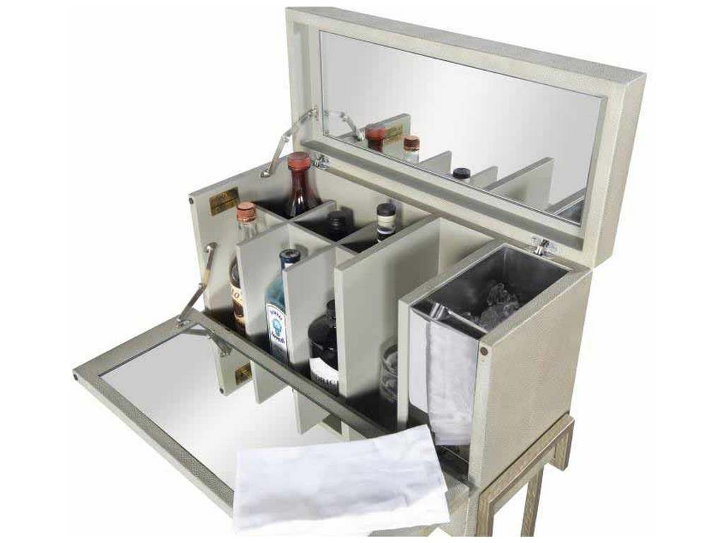 Product Description: Century Furniture MN5806 Laurent Bar In A Box - The Laurent is a transitional collection of leather wrapped forms embossed with a soft shagreen pattern finished in a Champagne coloration. The solid metal bases feature an artisanal texture that compliments the soft pebble grain of the shagreen. This bar on stand features a flip top with mirror in top, six bottle compartments, an ice bucket and a mirrored, drop-front panel that functions as a serving tray. Ideal for small rooms or places where you just need to create that extra serving area.
