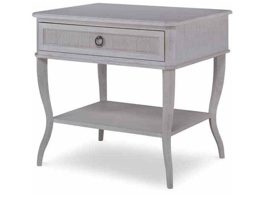 Product Description: Century Furniture MN5807 Hampton Small Nightstand - The Hampton's forms have classic roots that are reinterpreted in a softer, more casual and transitional look. Ash solids and veneers are finished in a soft, chalk stain allowing the pieces to cross design barriers and work in many interiors. This nightstand offers a picture framed drawer with a reeded design and pewter ring pull over an open shelf held by the four delicate tapered legs. The drawer features a soft close mechanism.