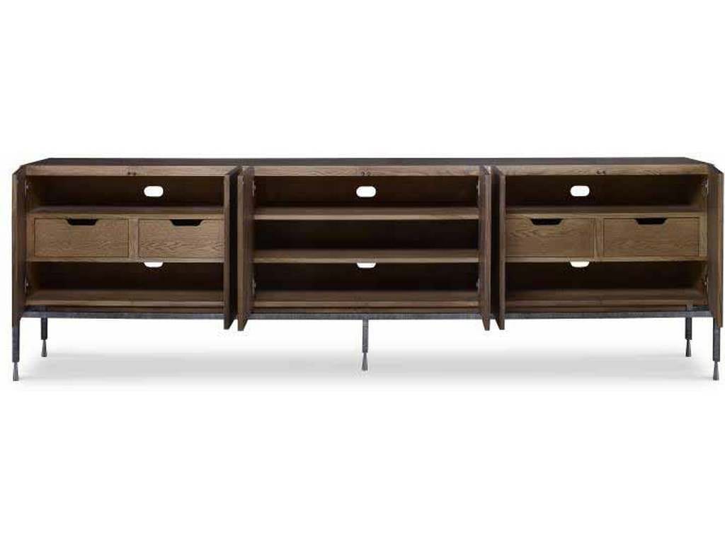 Product Description: Century Furniture SF5978 Gaston Credenza - The 110" Gaston is wrapped in beautiful figured Paldao veneer and sits on top of an architectural iron base. The clear dry finish really lets the exotic Figured Paldao shine through. This six door cabinet makes a statement in a entryway , dining room or family room. It is a versatile piece that can be used as a Credenza or Media Console.