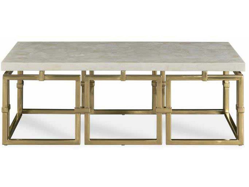 Product Description: Century Furniture SF5986 Links Small Cocktail Table - This beautiful statement cocktail table was inspired by classic jewelry links. Open cast brass fretwork base with a floating top made of crystal stone quartz in warm ivory tones. Also available as a large cocktail, side table, martini table console and desk.