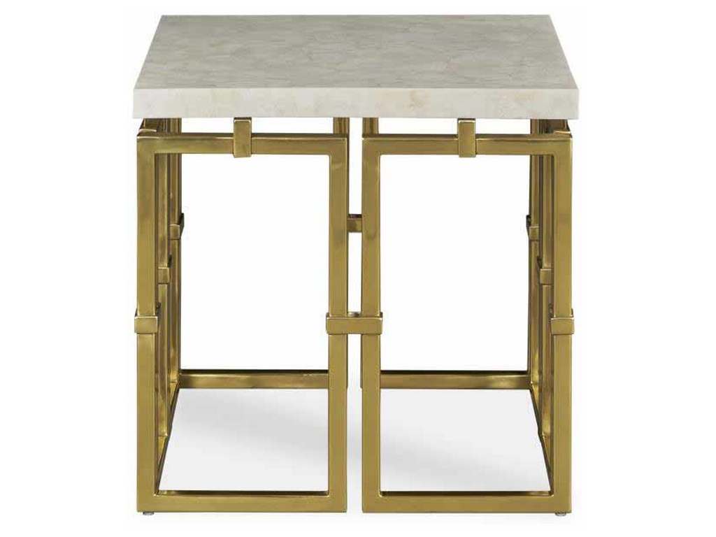 Product Description: Century Furniture SF5987 Links Chairside Table - This beautiful statement lamp table was inspired by classic jewelry links. Open cast brass fretwork base with a floating top made of crystal stone quartz in warm ivory tones. Also available as a large cocktail, smaller cocktail, side table, martini table, console and desk.