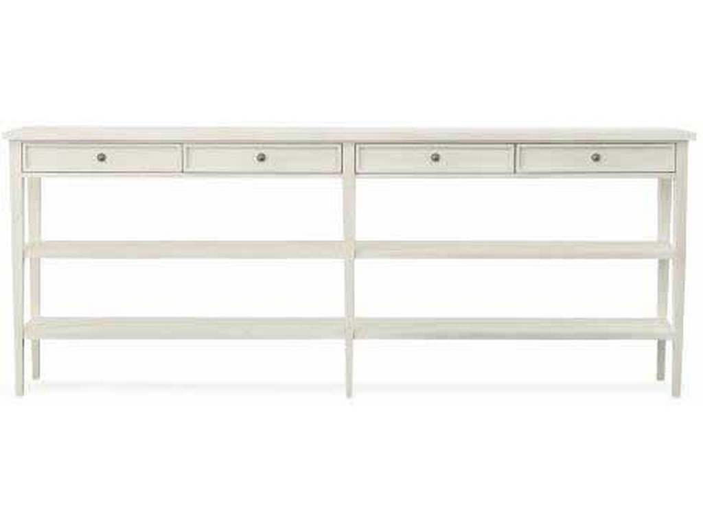 Product Description: Century Furniture SF6056-CN Delaney Console - Designed by Pride Sasser. An off-white finish on mahogany solids and veneers. Four drawers with pewter finish hardware above two open shelves.