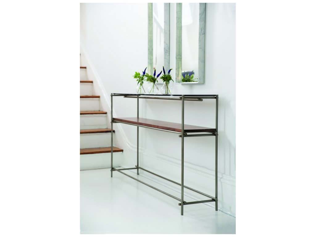 Product Description: Charleston Forge 6606 Collins 54 inch Console - Clean lines and a modern, feminine look are signature characteristics of furniture designer Katy Acuff's pieces. The Collins Collection is no exception. The tables are available with glass tops (either clear or bronze) with a choice of a glass or wood shelf. Wood species available are Maple and Walnut.
