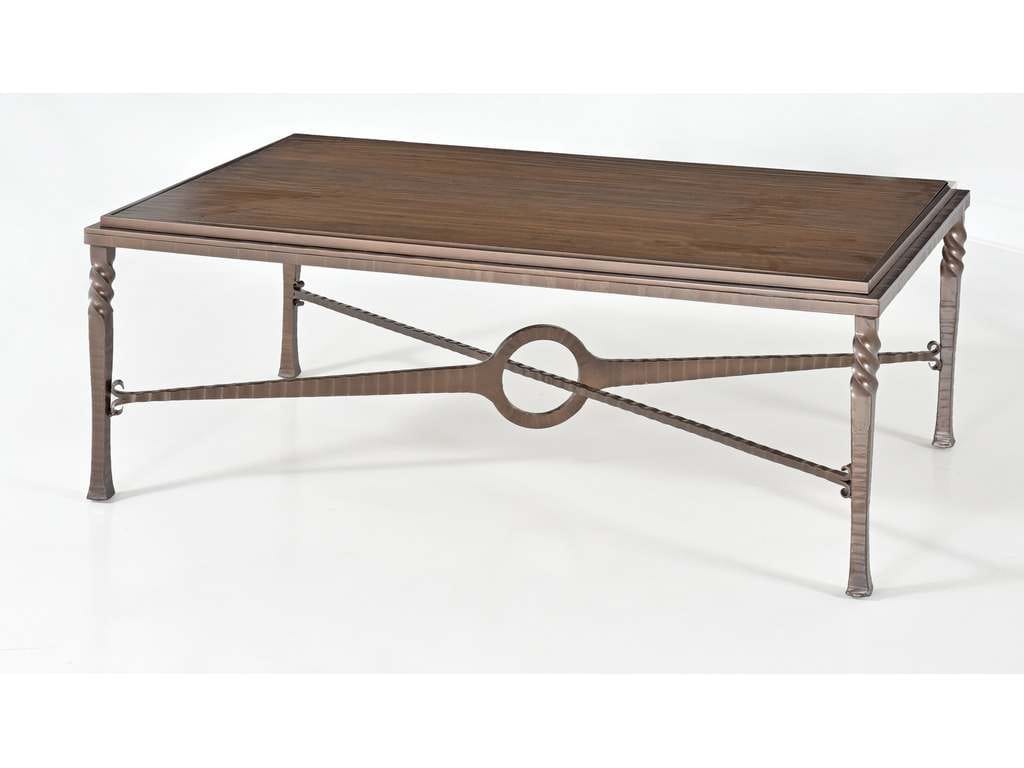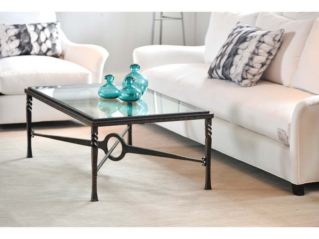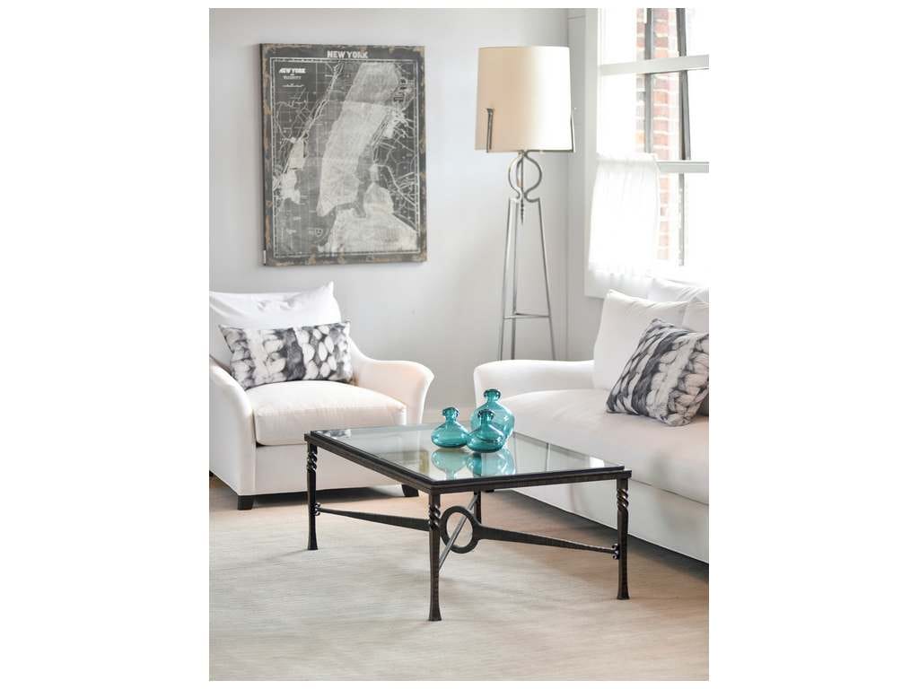 Product Description: Charleston Forge 7516 Omega Rectangular Cocktail Table - The unique crafting of the Omega Rectangular Cocktail Table features hand-twisted legs as well as unique stretchers, with one crossing through another. This lends a modern slant to the antique, hand-hammered piece. Designed by John Winer and available with a glass or maple top, it will be a singular focal point in any room in your home.