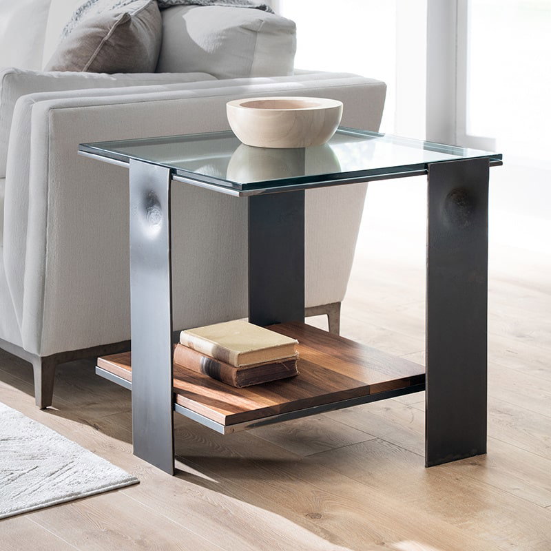 Product Description: Charleston Forge 7570 Caldera End Table - Caldera End Table is crafted from hand-forged steel and paired with your choice of solid wood or glass, the Caldera Collection makes a bold, modern statement. Its broad steel base showcases the strength and character of the material, while the warmth of the wood—or the sleek clarity of glass—creates a striking contrast.