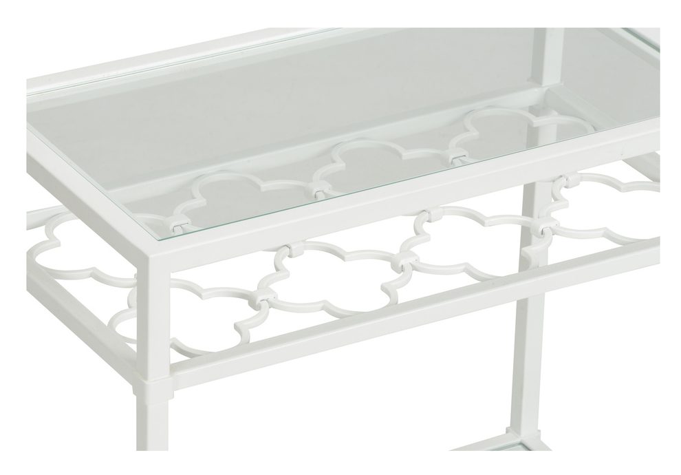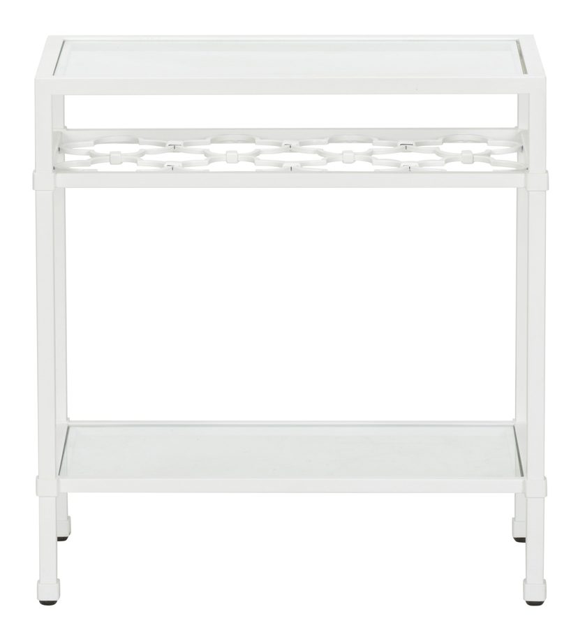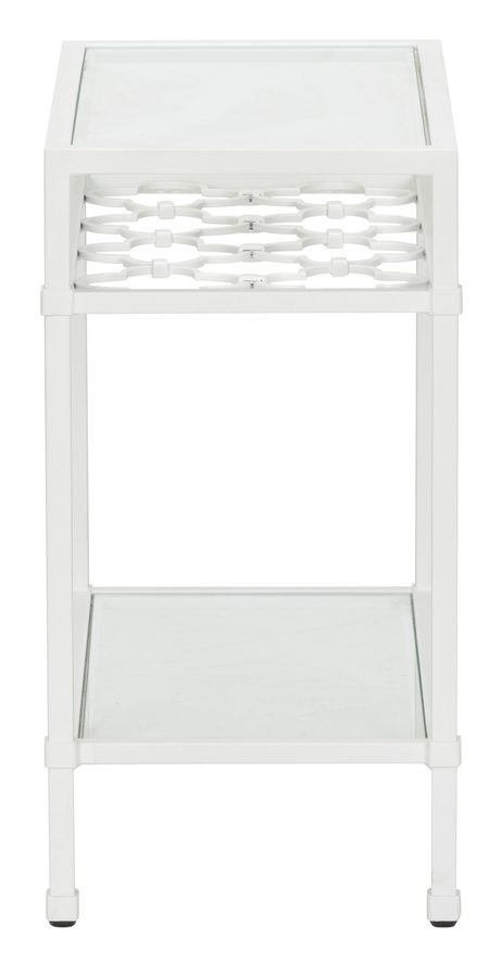 Product Description: Chelsea House 370061 Pacific Coast Side Table White - Enhance your living area our Pacific Coast Side Table. This elegant 23" table is crafted of metal with a white finish and has two shelves for displaying your treasured photographs, books or accent pieces. It features a shelf with a quatrefoil design shown off through the top glass shelf.