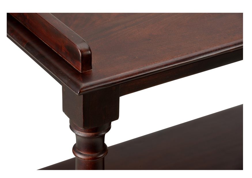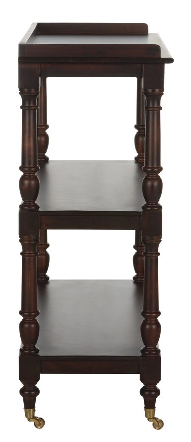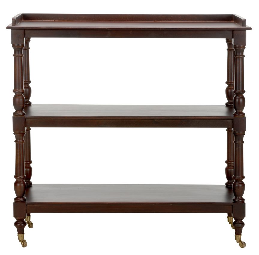 Product Description: Chelsea House 370266 Butlers Trolley - Crafted from rich mango wood, the cart features three spacious open shelves, offering ample open storage for your favorite beverages, glassware, and bar essentials. The natural wood grain adds warmth and character, while the sleek brass wheels provide a touch of elegance and easy mobility. Ideal for entertaining or simply adding a stylish storage solution to your space, this bar cart combines practicality with a sophisticated design, making it a standout piece in any home.