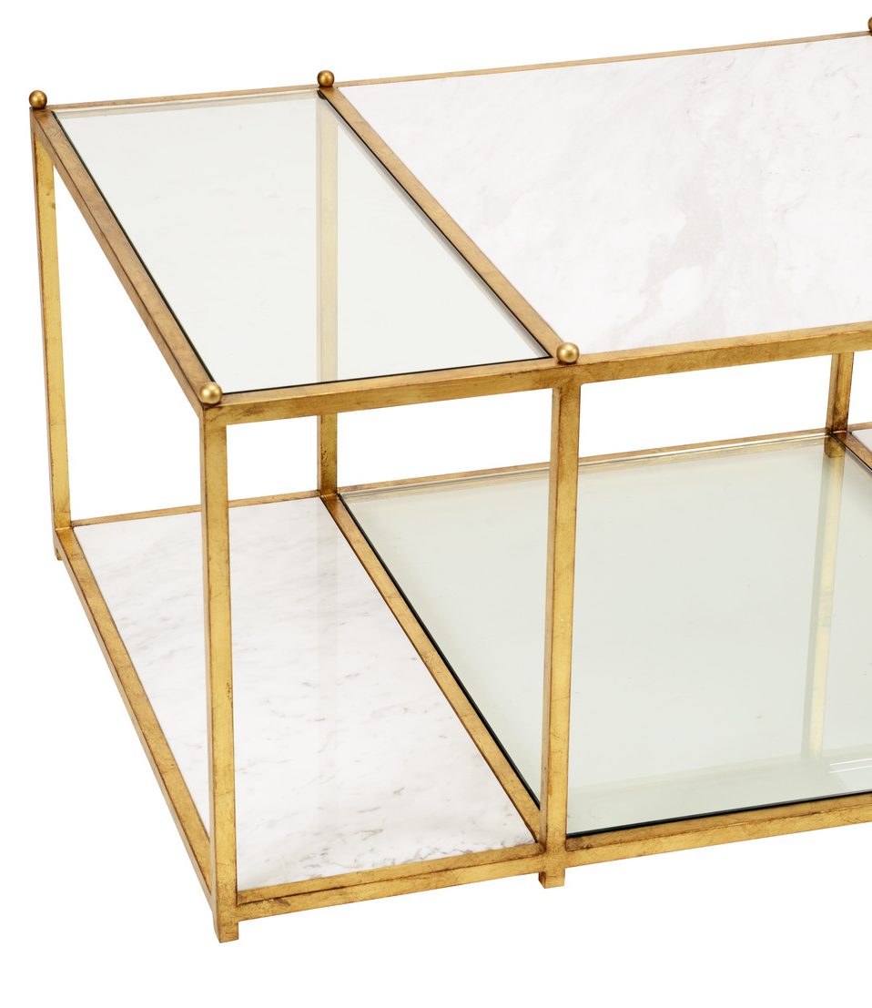 Product Description: Chelsea House 383227 Directoire Stripe Coffee Table - Antique gold leaf iron coffee table with natural white marble and clear glass, designed by Jamie Merida.