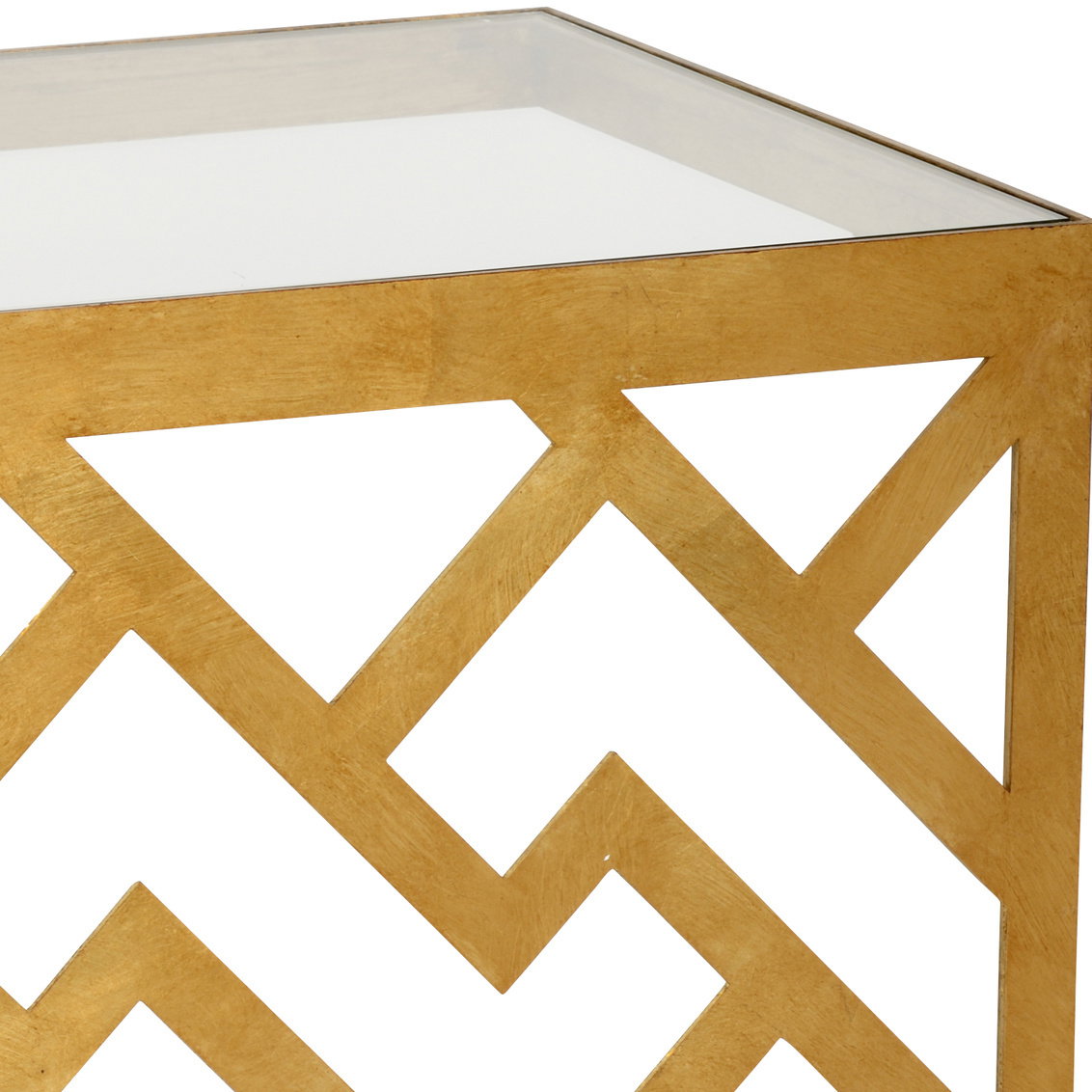 Product Description: Chelsea House 383381 Taormina Side Table - Add function and beauty to your living space with Taormina Side Table. Featuring antique gold leaf finish on iron and a clear glass top, this striking c-table has an eye-catching geometric pattern. Pull it up to your favorite chair for easy access to your drink or reading material. Designed by Claire Bell.