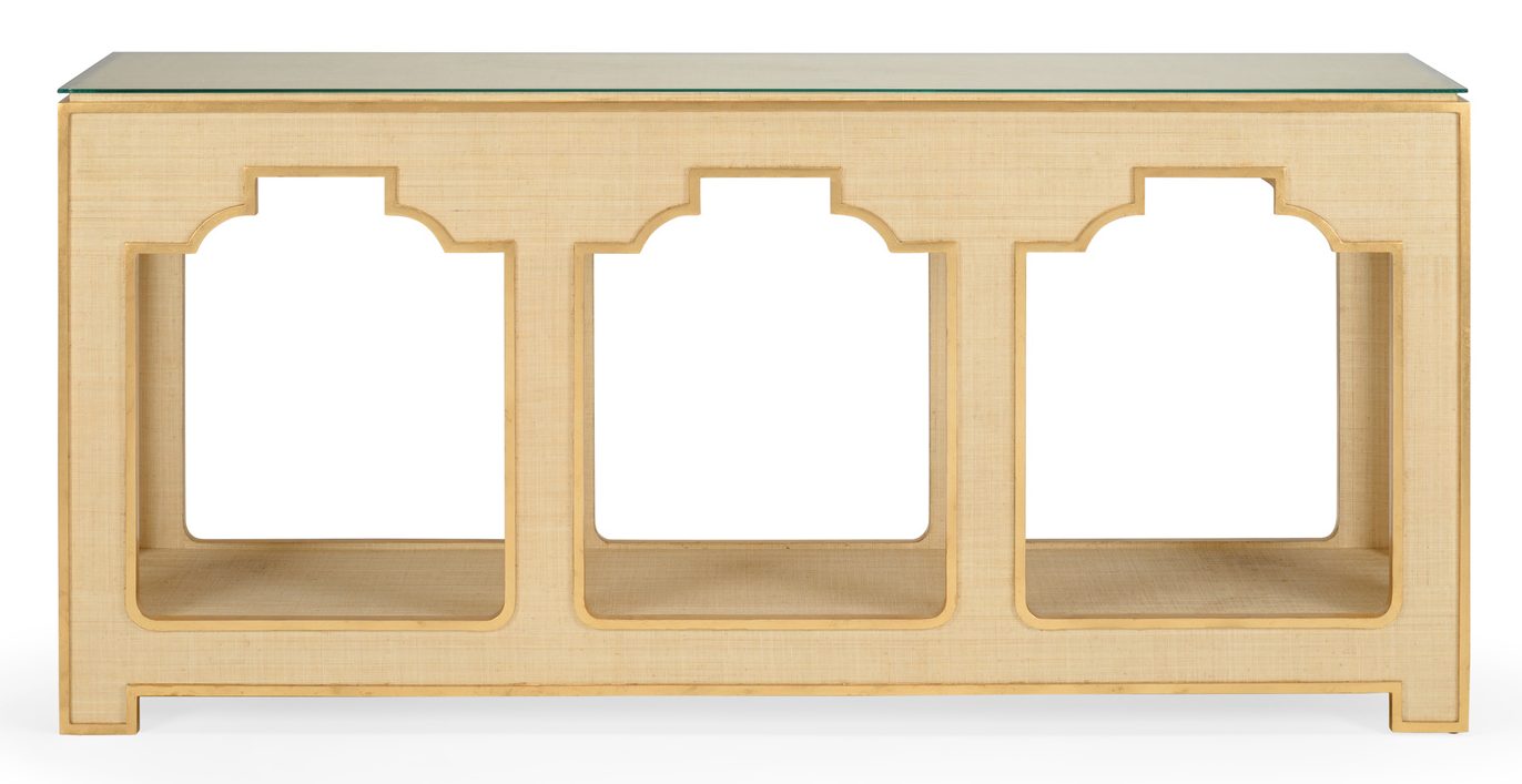 Product Description: Chelsea House 384729 Yangon Console - Cream - Cream colored raffia console with gold accents and a tempered glass top, designed by Jamie Merida.