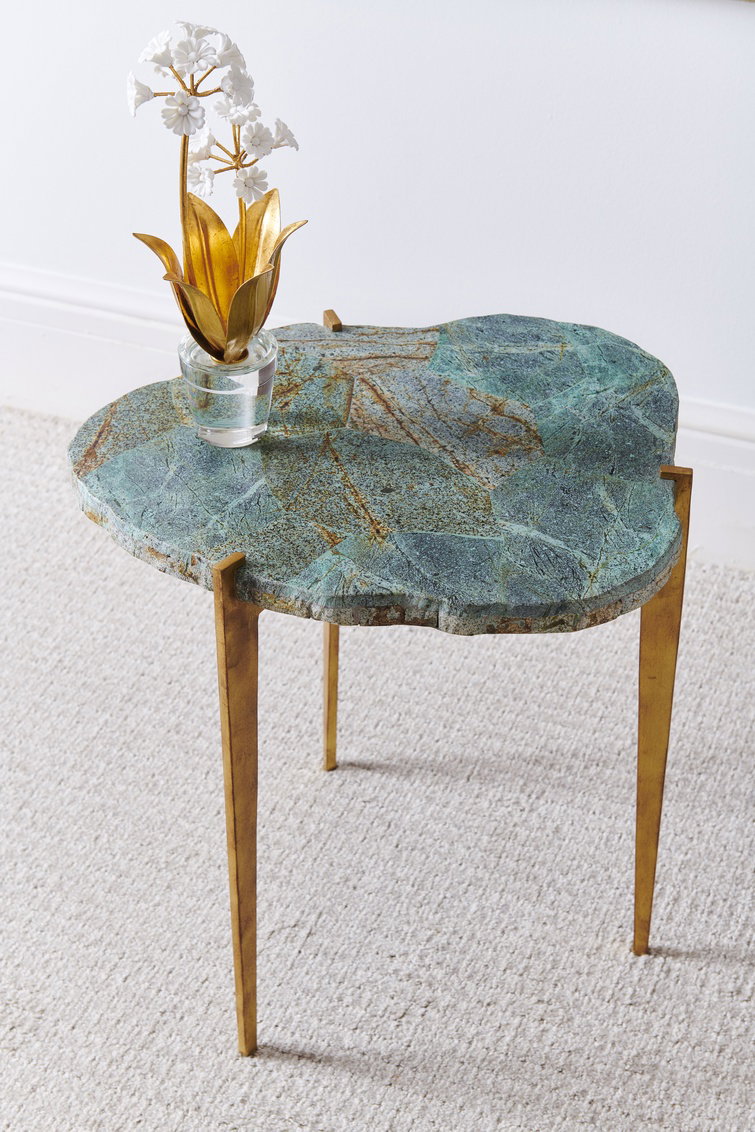 Product Description: Chelsea House 384956 Philippine Malachite Table - Organically shaped malachite stone veneer over wood atop three gold iron legs. A perfect blend of substantial stone and modern gold legs.