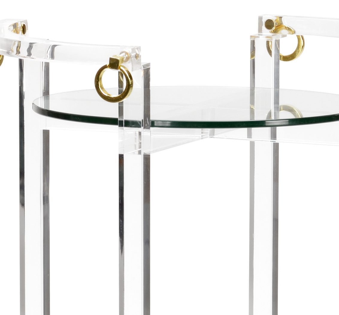Product Description: Chelsea House 385023 Milton Pedestal - Acrylic pedestal with two tempered glass shelves and polished brass decorative rings. Designed by Claire Bell.