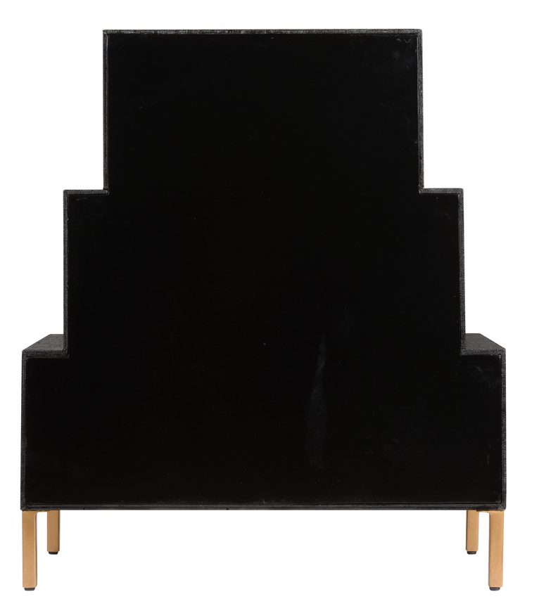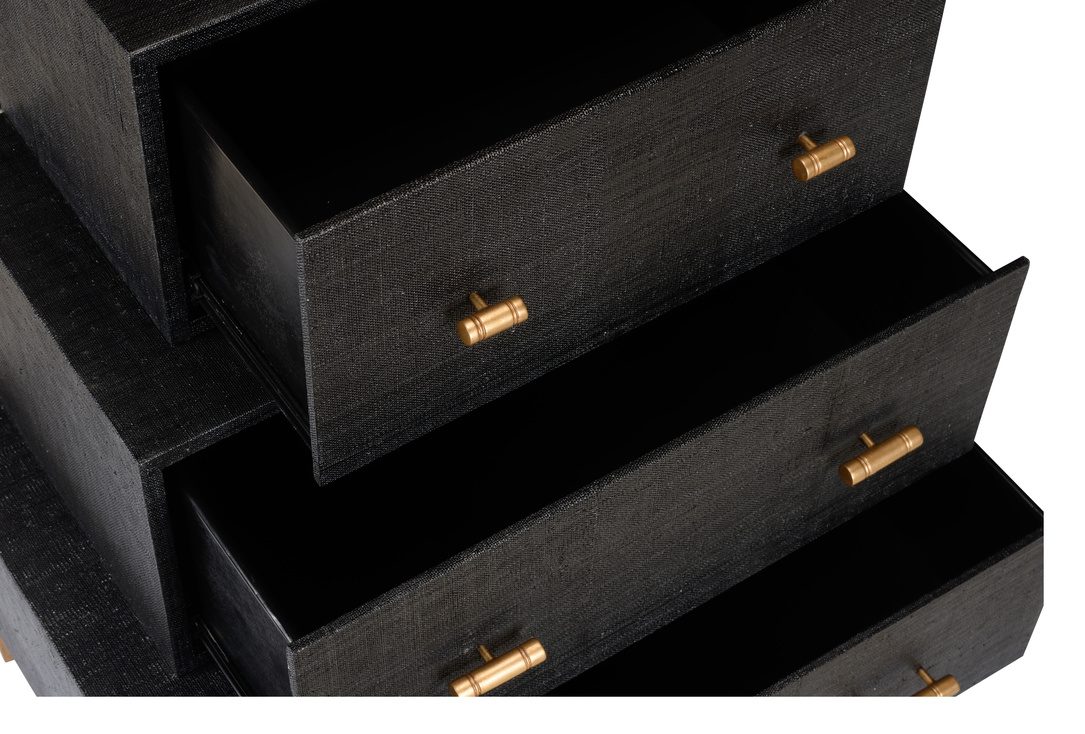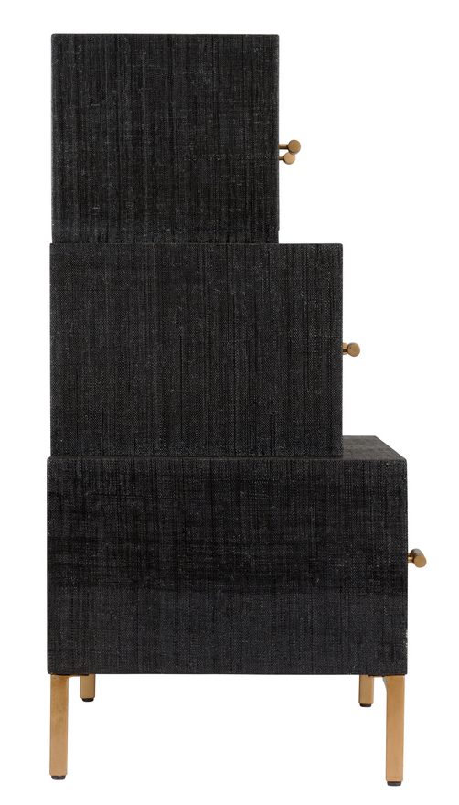 Product Description: Chelsea House 385145 Three Tiered Chest - Stunning three tiered chest. Wood covered with black raffia and antique gold metal handles. Not intended for clothing storage. Designed by Claire Bell.