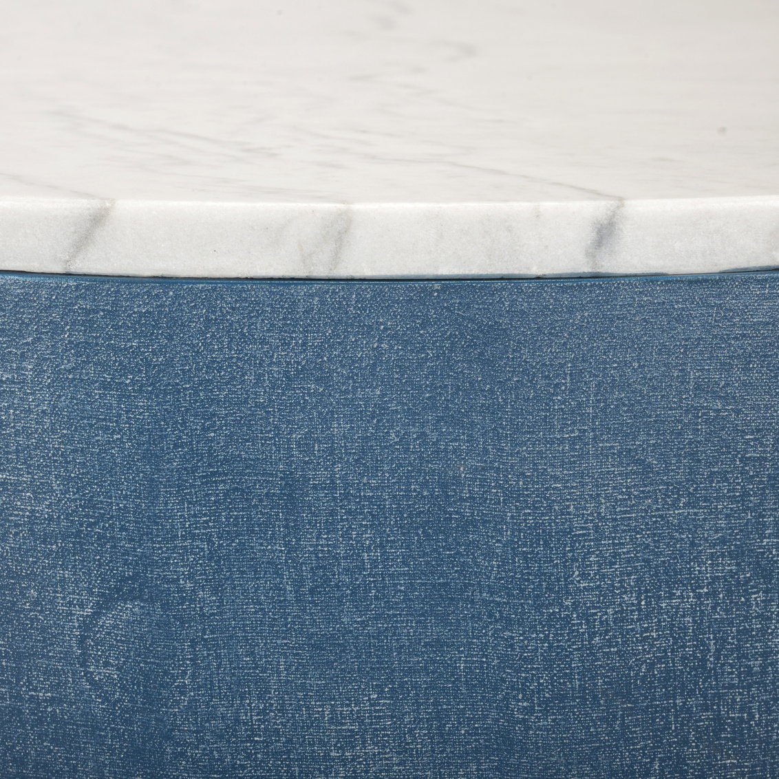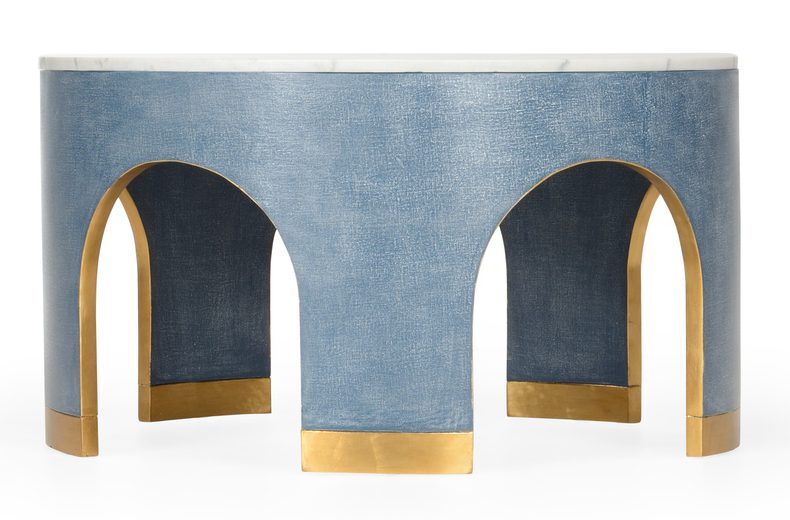 Product Description: Chelsea House 385206 Aqueduct Cocktail Table Blue - Beautiful, unique and functional, the Aqueduct Cocktail Table sports blue grass cloth with marble top and antique gold leafed accents. Designed by Elizabeth Wicker.