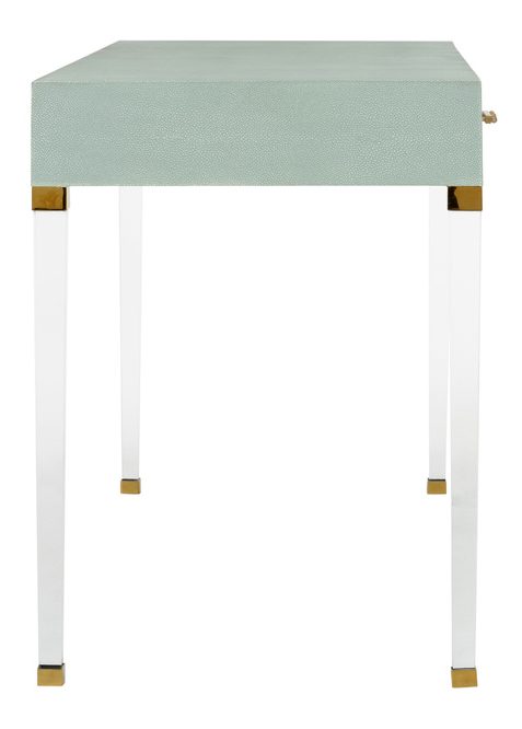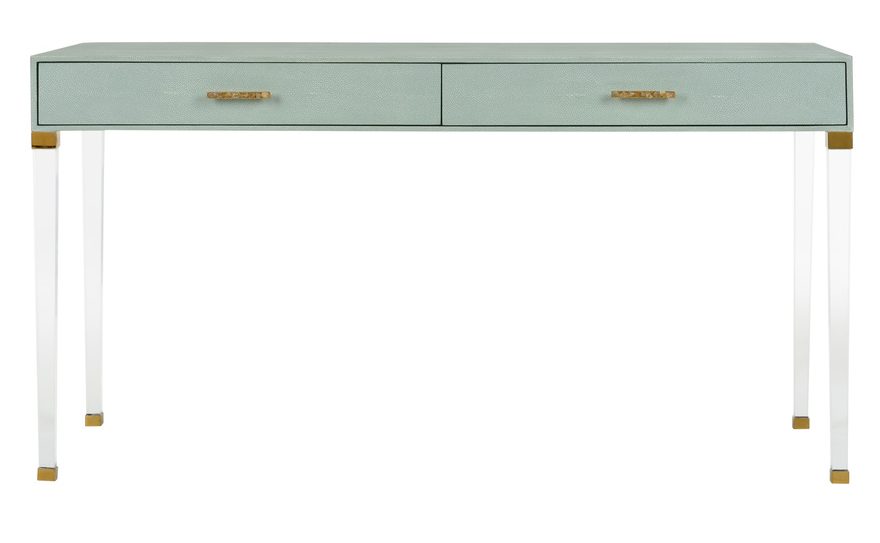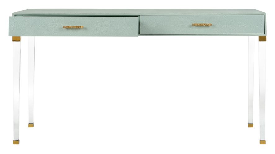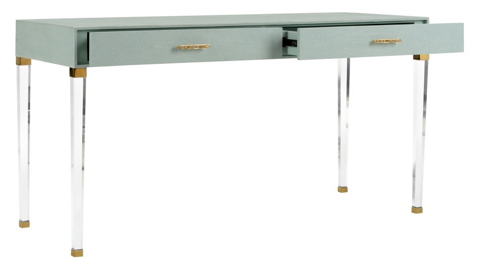Product Description: Chelsea House 385625 Camilla Desk - Taking its cue from a neoclassic shape, the Camilla Desk features contemporary and unexpected details. With hand wrapped light gray/green faux shagreen, acrylic legs and raw crystal cluster drawer pulls, this piece is meant to bring flair to any space. Designed by Shayla Copas.