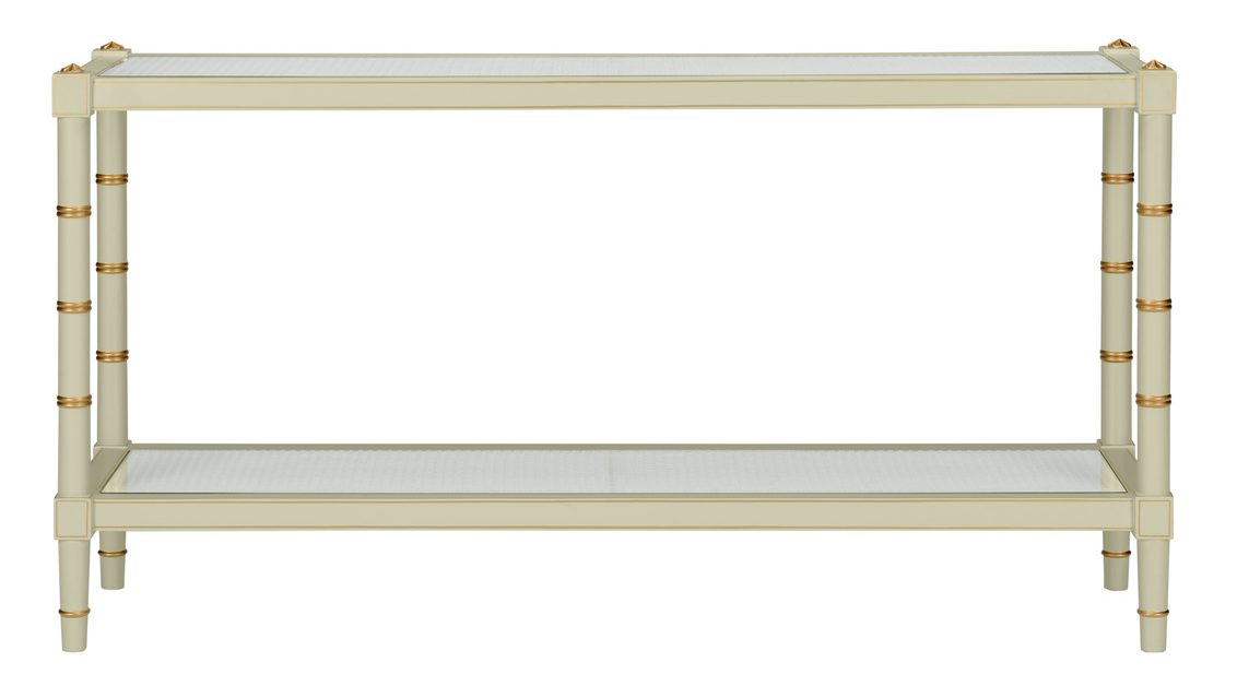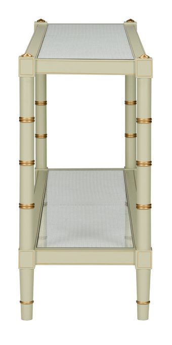 Product Description: Chelsea House 385711 Conner Cane Console Green - The Conner Console Table in green is adorned with gold hand-painted detailing around the edge of the bamboo-inspired legs and natural caned shelf. Perfect for any room that needs a pop of color. Designed by Bill Cain.