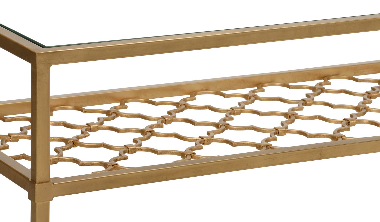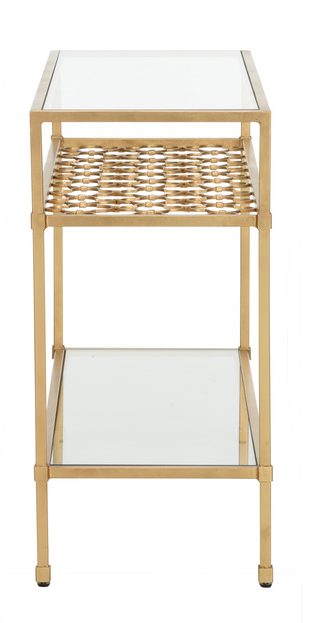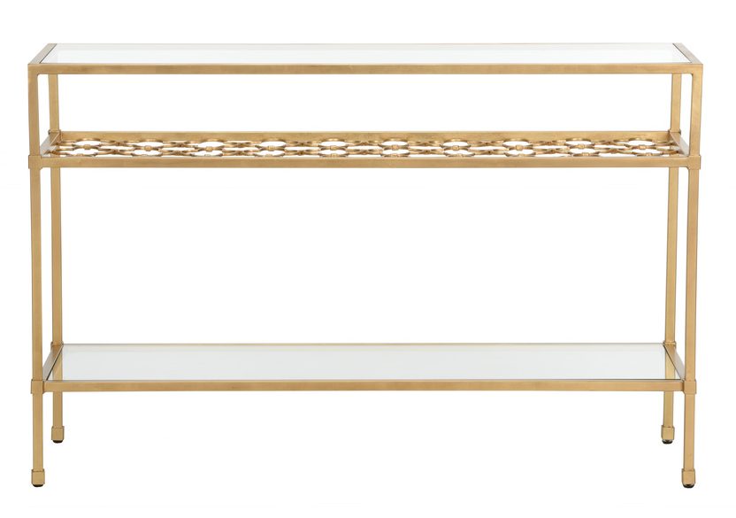 Product Description: Chelsea House 385954 Pacific Coast Console Table Gold - Narrow and sleek, perfect for displaying in your sitting room or entry way. The Pacific Coast Console is made of an iron frame finished with an antique gold finish with two glass shelves, one on top and one below for the right amount of storage and display options. Designed by Bill Cain.