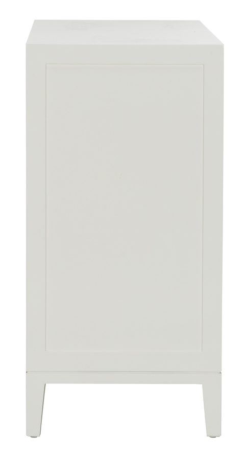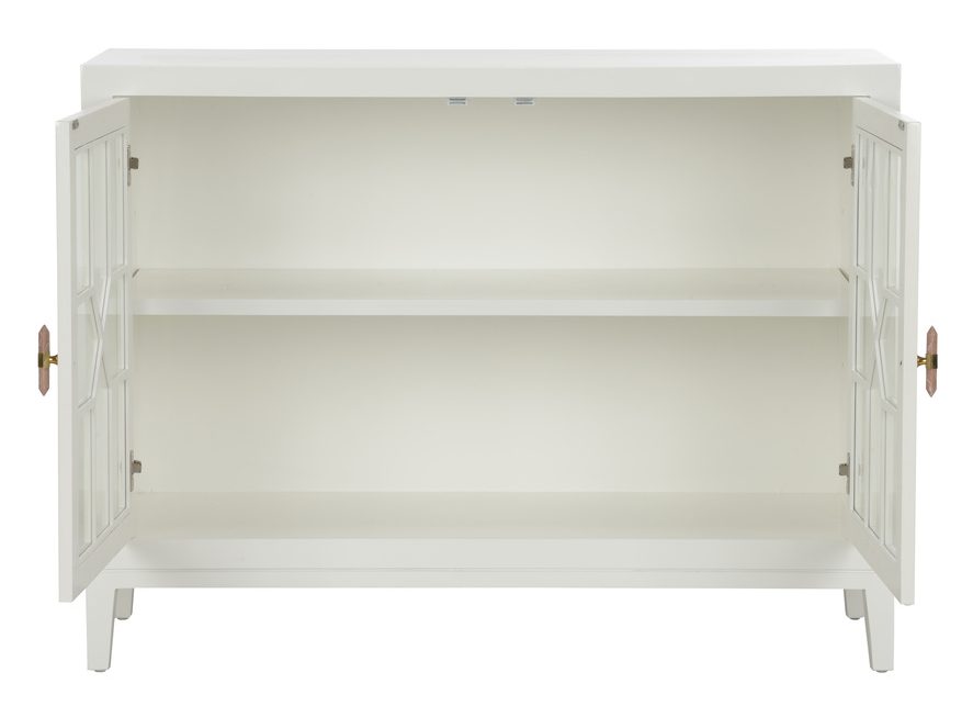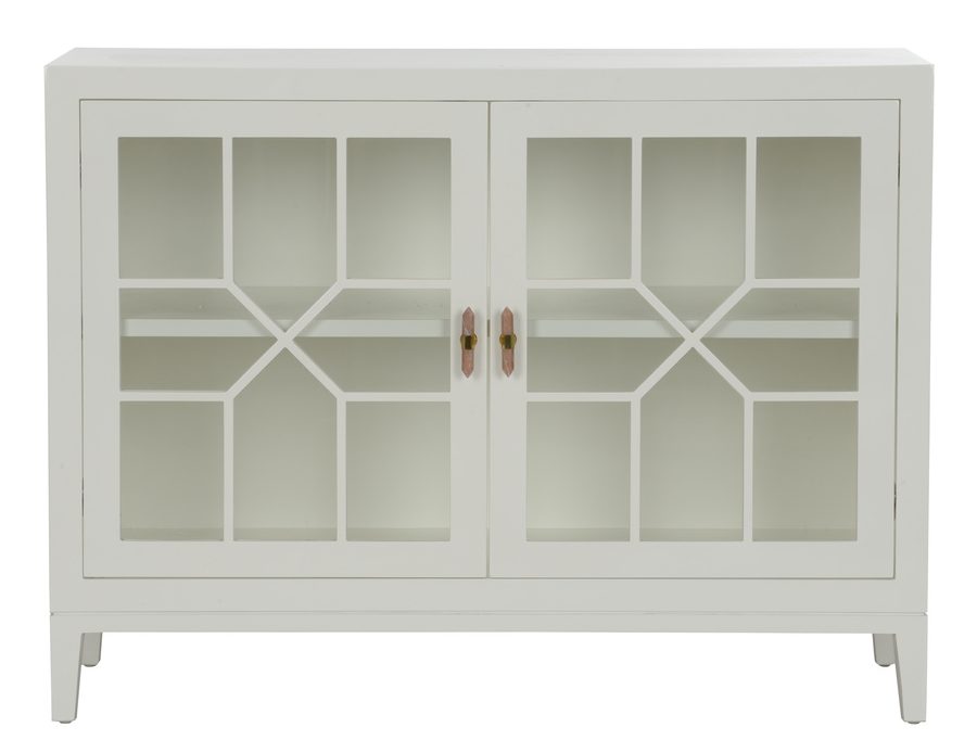 Product Description: Chelsea House 385979 Silhouette Chest - Making storage practical and aesthetically pleasing, the Silhouette Chest features a white painted finish with windowpane doors exposing the double shelving inside. Finished with rose quartz stone door pulls for a glamorous detail. Designed by Lisa Kahn.