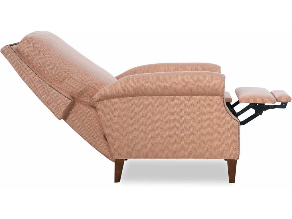 Product Description: CR Laine 1475-05MR David Manual Recliner - Semi-Attached Box Border Back, French Seamed, Standard with small brass nail trim and Allow 18" distance from wall for full reclining position. Fully Reclined Depth: 66D. Shown with: Retired Fabric, Walnut Finish, Small Antique Nail Trim.
