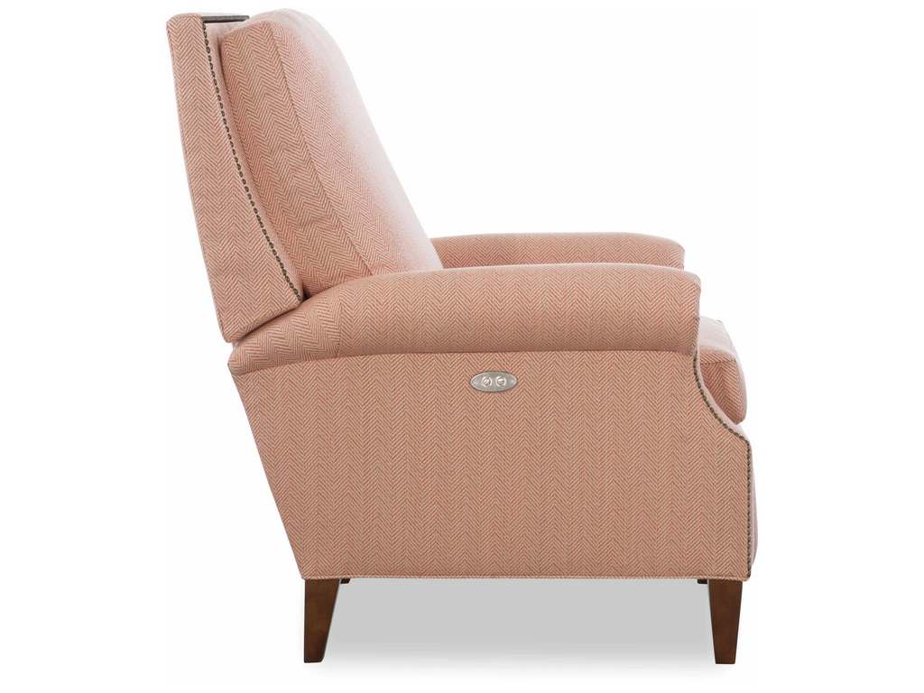 Product Description: CR Laine 1475-05PR David Power Recliner - Semi-Attached Box Border Back, French Seamed, Standard with small brass nail trim and Allow 18" distance from wall for full reclining position. Fully Reclined Depth: 66D. Shown with: Retired Fabric, Walnut Finish, Small Antique Nail Trim.
