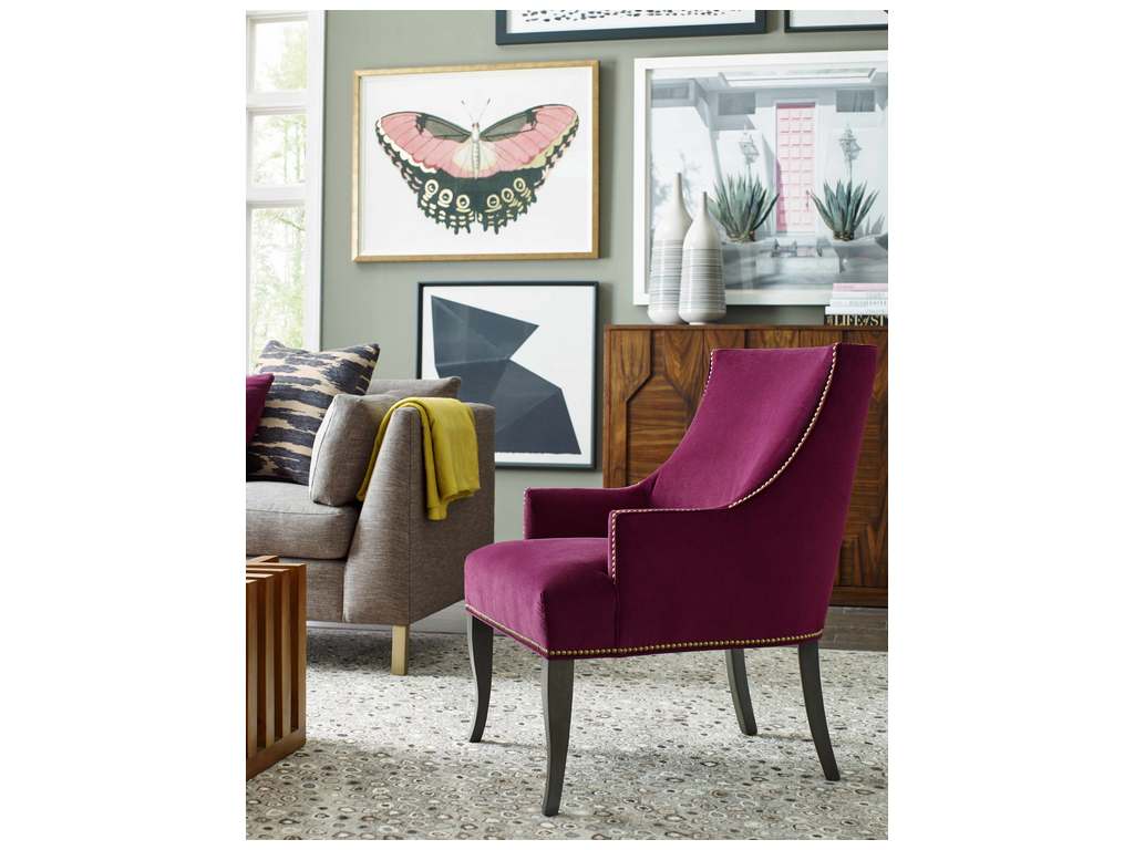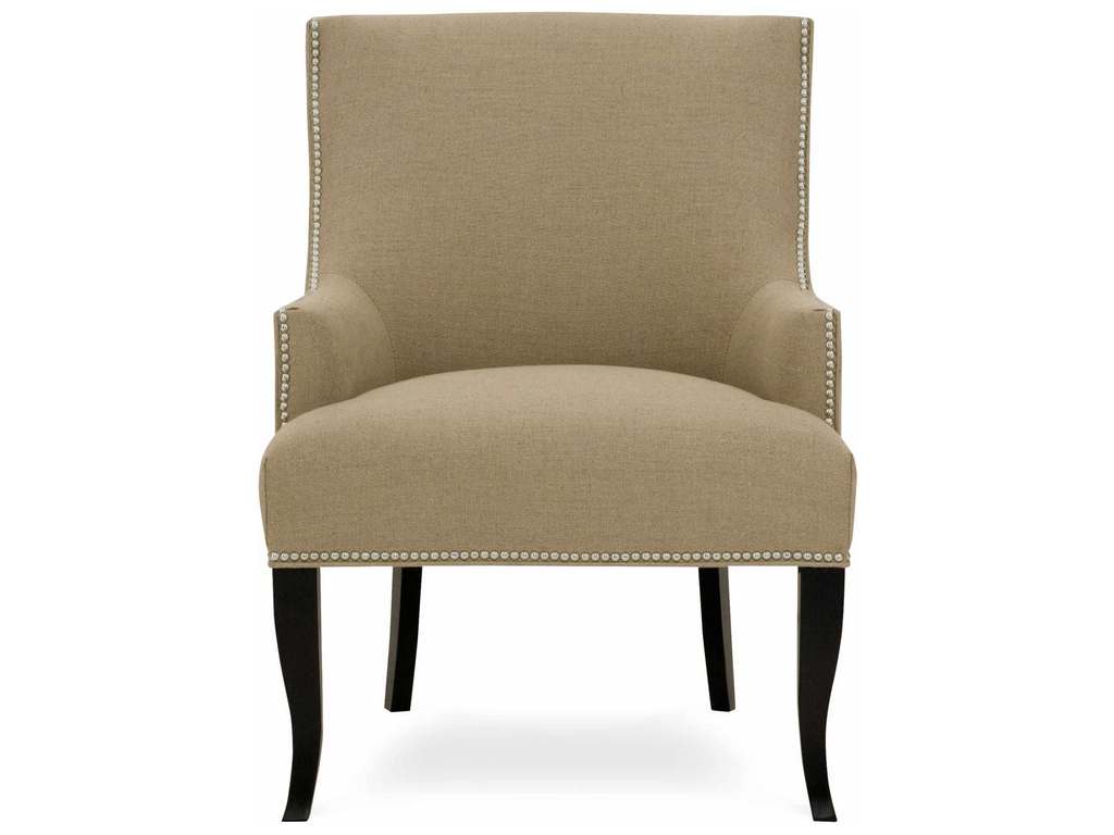 Product Description: CR Laine 425 Tumnus Chair - Standard with small brass nail trim. Shown With: Inspire Linen Fabric, Pepper Finish, and Small Pewter Nail Trim/