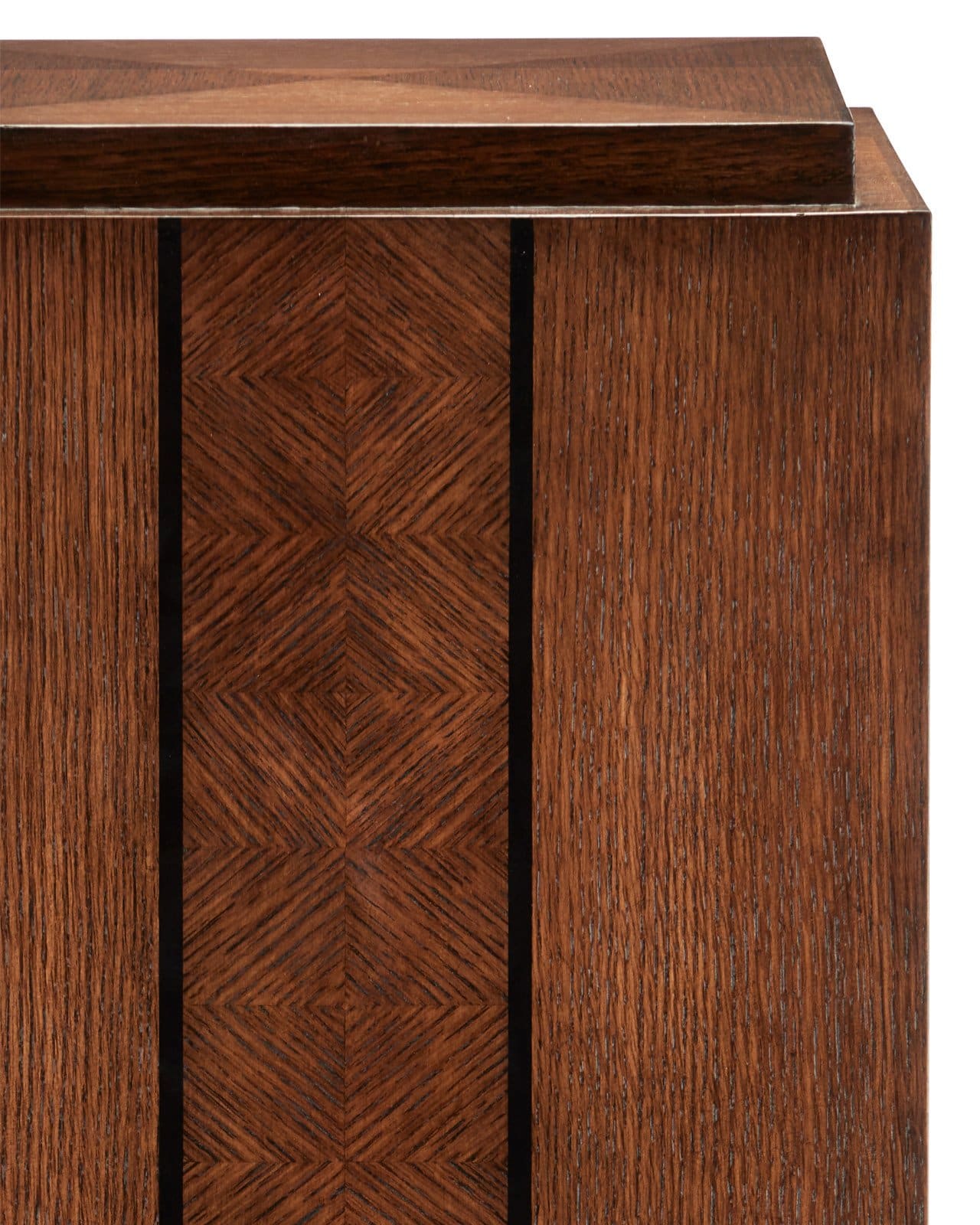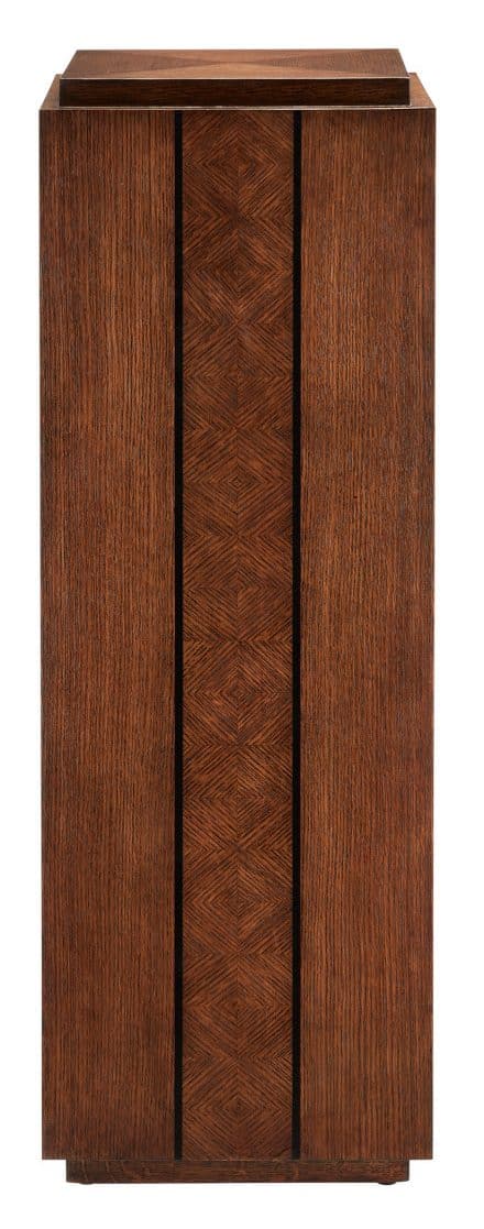 Product Description: Currey and Company 1000-0140 Dorian Pedestal - With gorgeously rich surface details, the Dorian Pedestal is clad in oak veneers that are laser cut and laid in place like pieces being fitted into a jigsaw puzzle. The panels of diamond box patterns are flanked by black racing stripes to add depth to the piece. The fact that each element is cut and hand-applied makes this an artisanal statement, and the inset base and top add character to the wood pedestal.