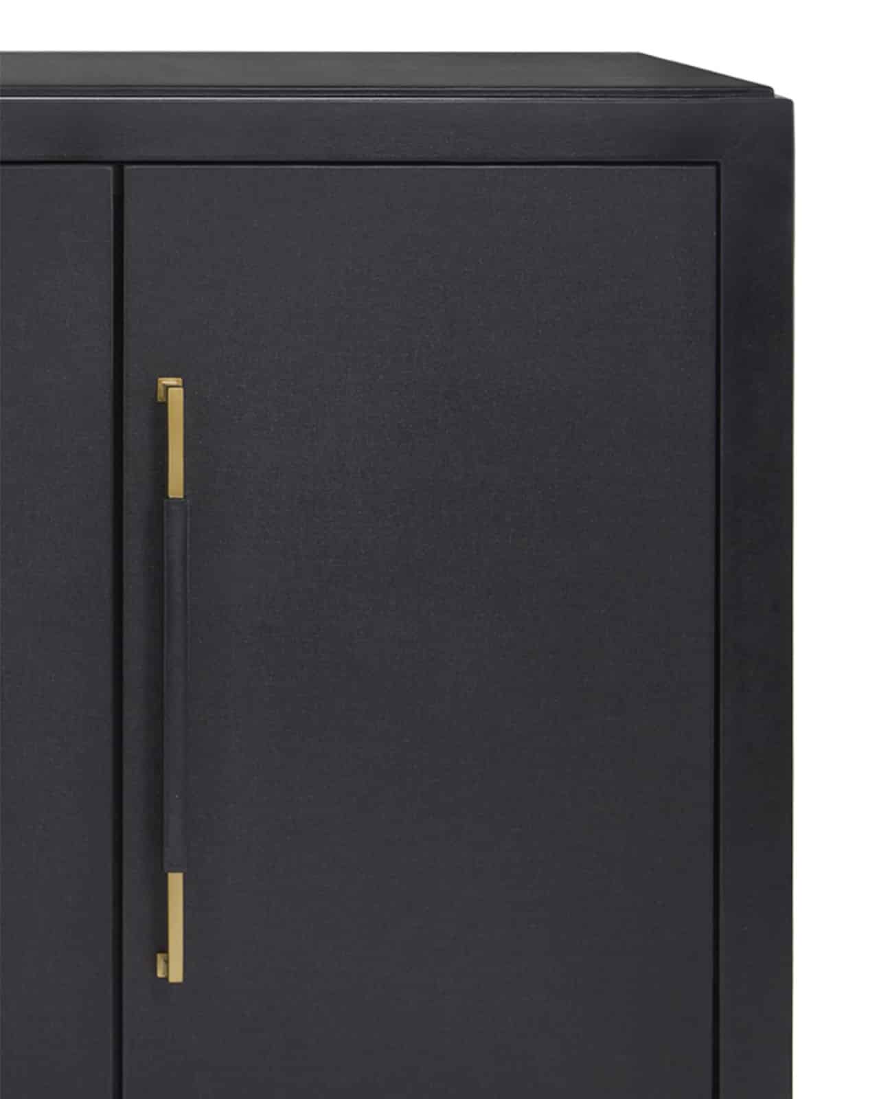 Product Description: Currey and Company 3000-0037 Verona Black Sideboard - The Verona Black Sideboard is darkly handsome covered in black lacquered with metal detailing in a champagne finish. The stretchers on this minimalist sideboard bring it its flair.