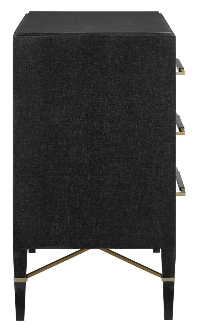 Product Description: Currey and Company 3000-0065 Verona Black Chest - The Verona Black Chest is darkly handsome covered in black lacquered linen with metal detailing in a champagne finish. The stretchers on this minimalist chest bring it its flair.