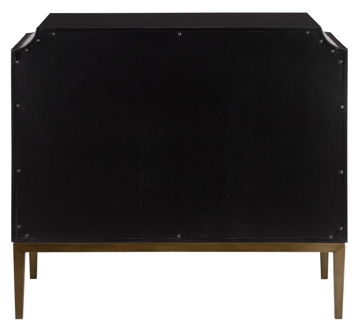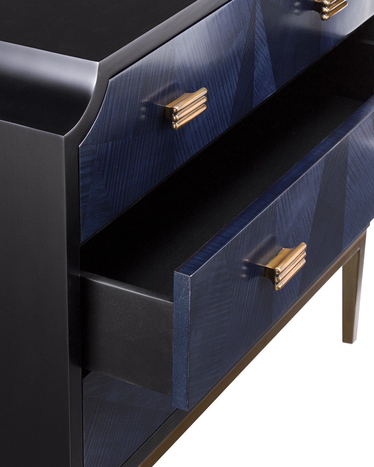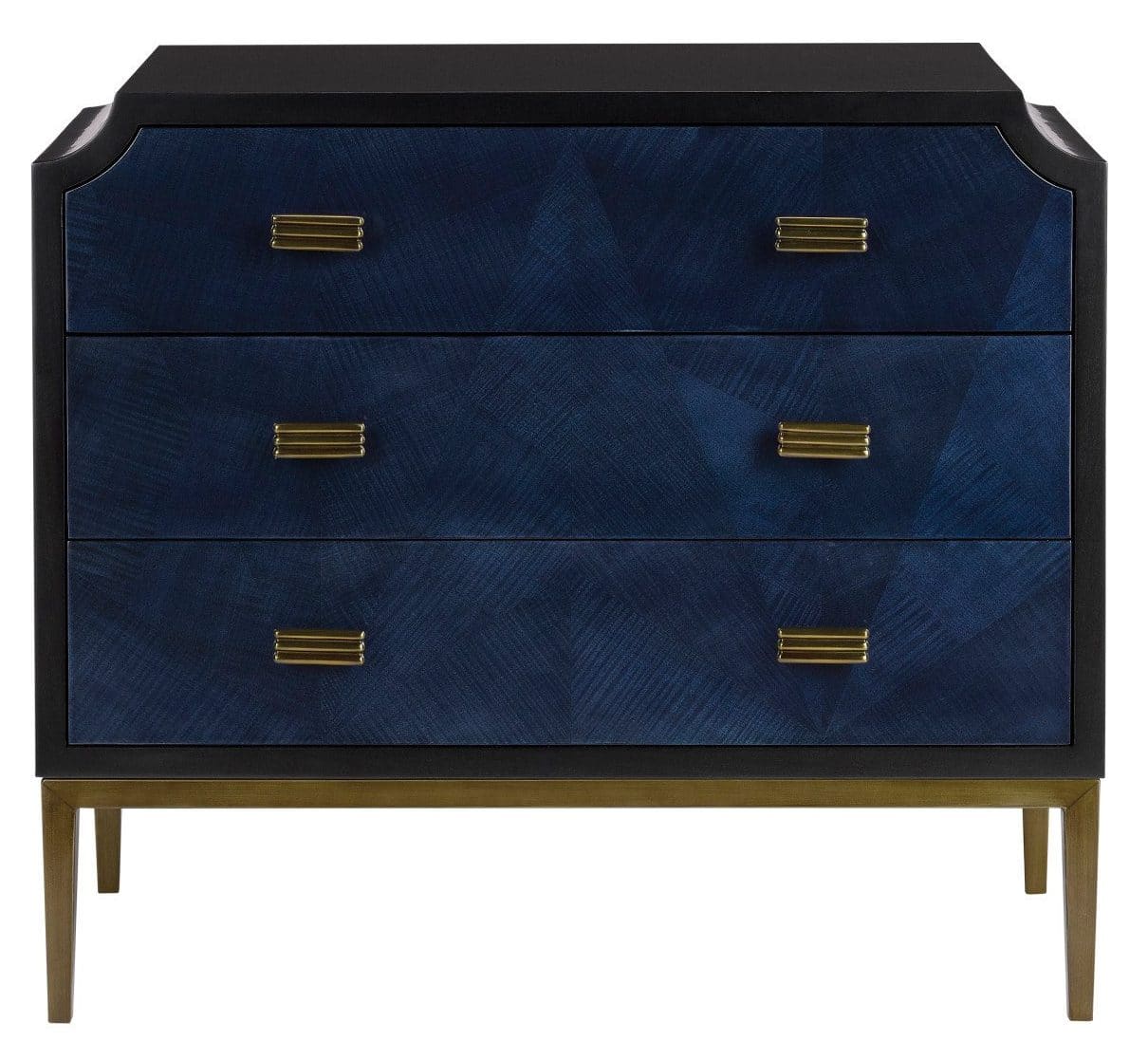 Product Description: Currey and Company 3000-0124 Kallista Blue Chest - The Kallista Blue Chest has a dark sapphire blue finish that enlivens the sycamore veneers on its door fronts. The wood grains bring the navy blue chest a hint of distressing that contrasts the sleek lines of the base and the door pulls in an antique brass finish. The exterior is finished in a glossy caviar black. Design details on this chest include soft-close door hinges, and adjustable shelves and glides.