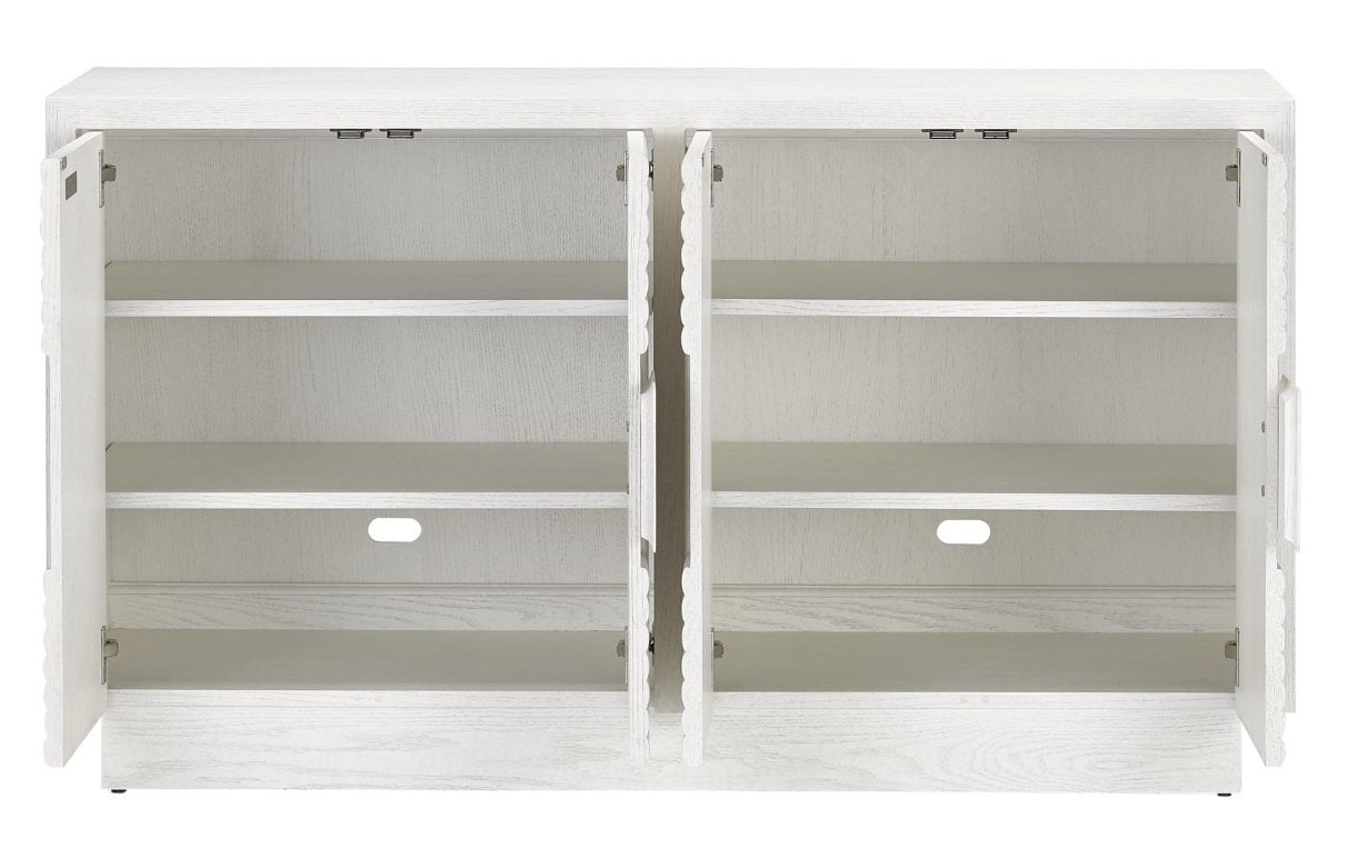 Product Description: Currey and Company 3000-0151 Morombe White Cabinet - The cerused white finish on the Morombe White Cabinet, made of white oak, highlights the patterns of natural wood that form embedded squares in a geometric illusion of depth. The centuries-old finishing technique is designed to draw out the detail and character of the wood grain on this on this white cabinet.
