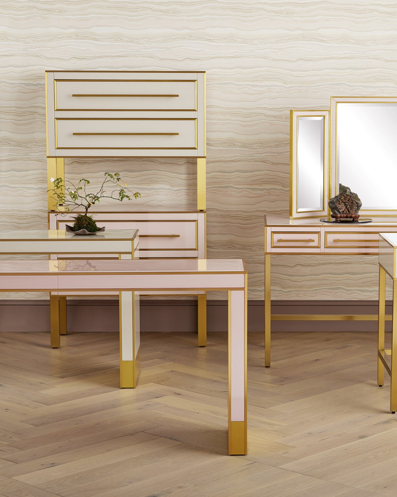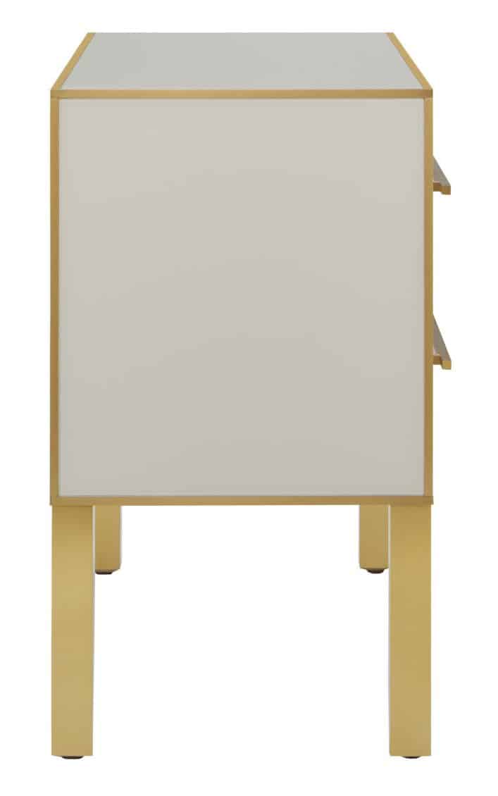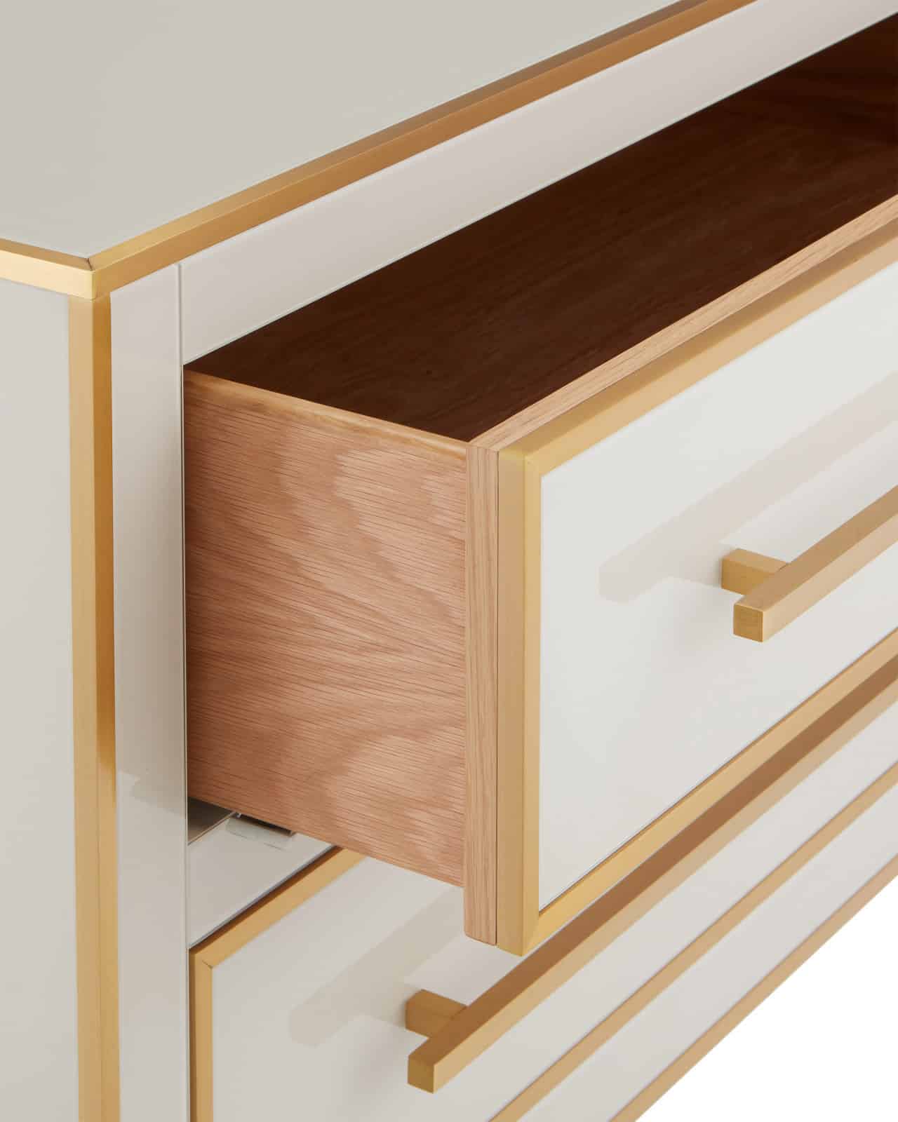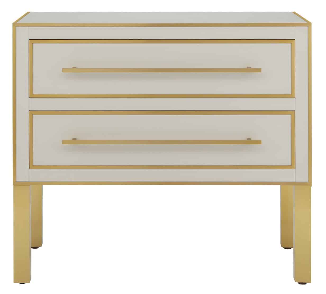 Product Description: Currey and Company 3000-0184 Arden Ivory Chest - The Arden Ivory Chest is inspired by a 1970s reverse-painted glass antique our found at the Paris flea market. The chest features ivory reverse-painted glass panels on the top, front, and sides with solid brass trim, hardware, and legs. The ivory and gold chest has a beveled top, and drawers with soft-close glides.