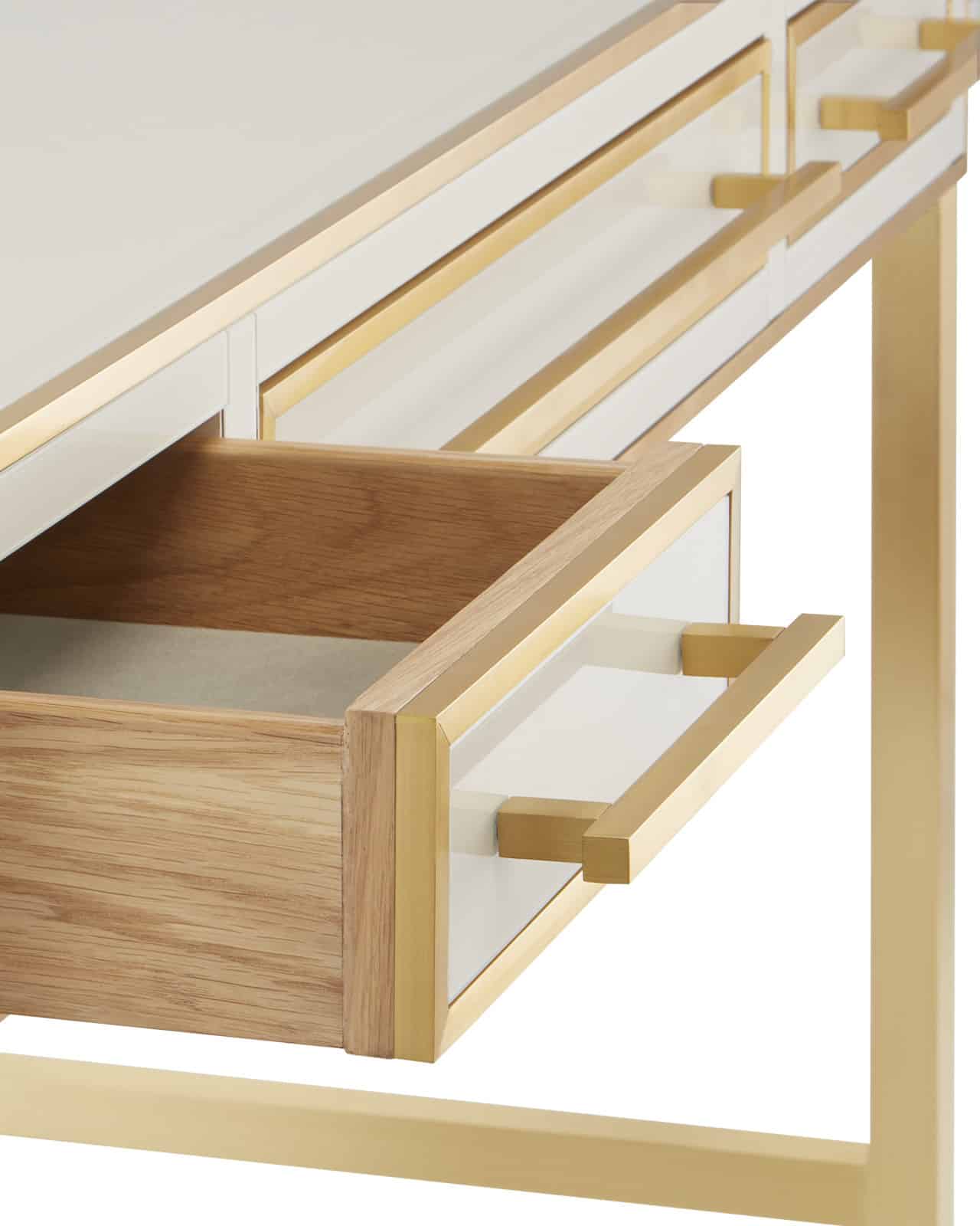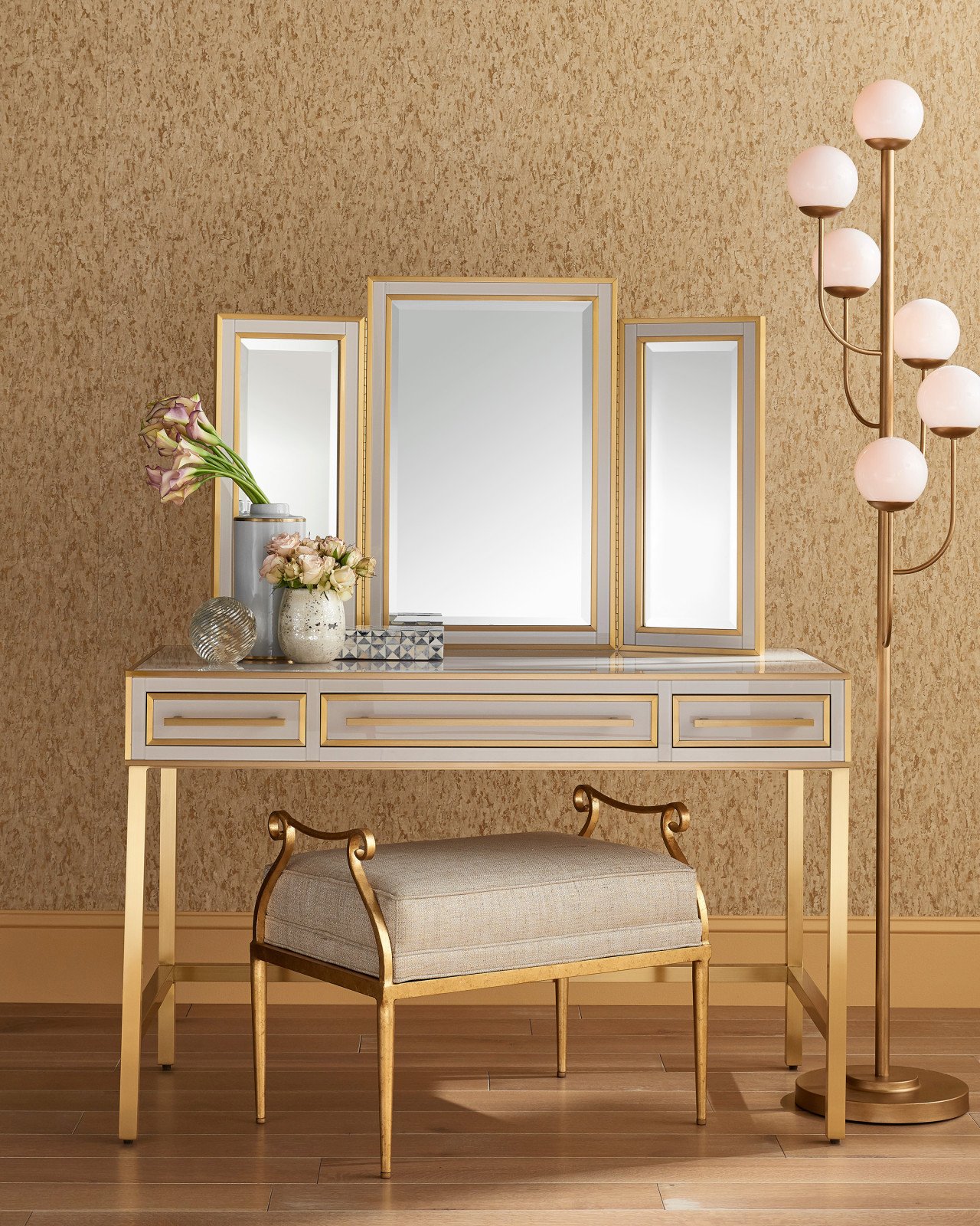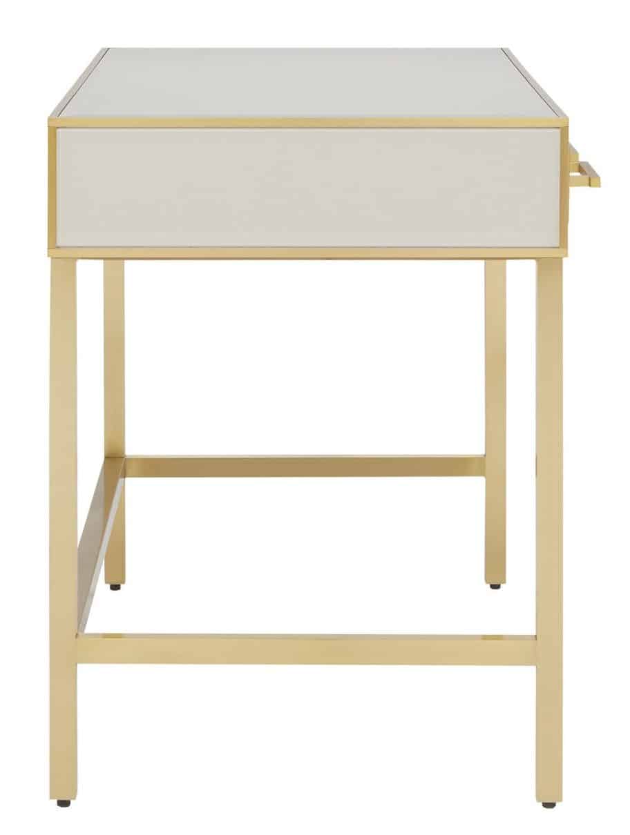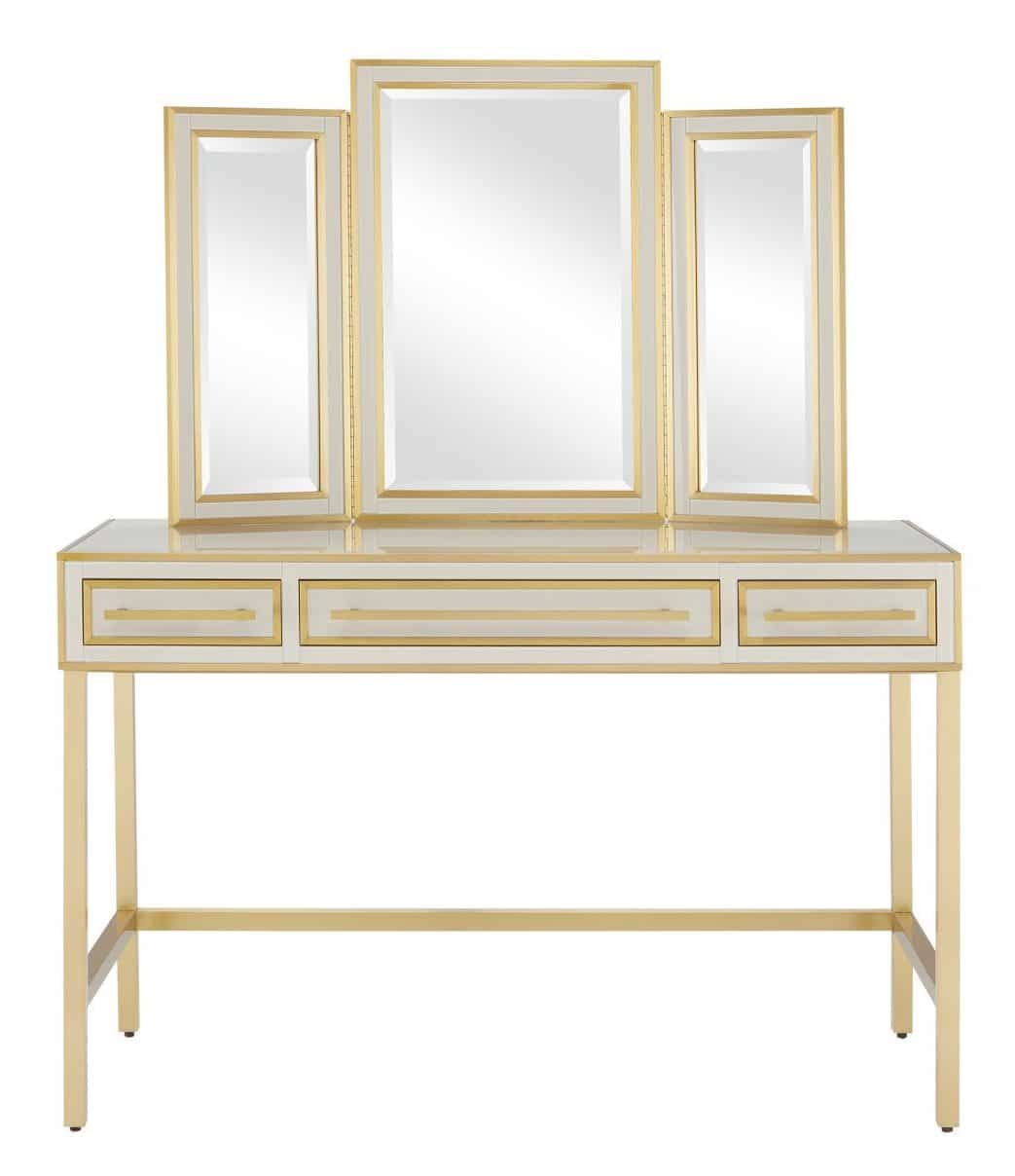 Product Description: Currey and Company 3000-0185 Arden Ivory Vanity - The Arden Ivory Vanity is inspired by a 1970s reverse-painted glass antique found at the Paris flea market. The vanity features ivory reverse-painted glass panels on the top, front, and sides with solid brass trim, hardware, and legs. The ivory and gold vanity has a beveled top and drawers with soft-close glides. A beautiful matching vanity mirror is sold separately.