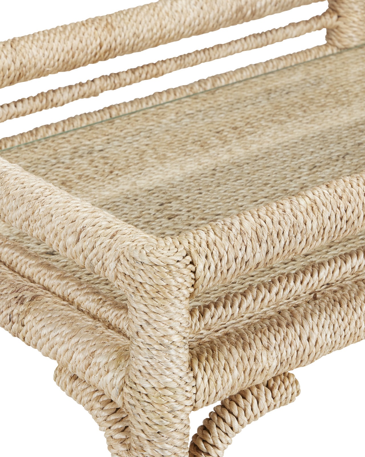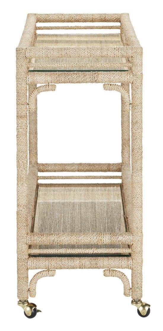Product Description: Currey and Company 3000-0218 Olisa Rope Bar Cart - With the earthy feel of rattan and wicker, the Olisa Rope Bar Cart is covered in braided abaca rope to bring a natural elegance to a room. The dexterity required to wrap a piece of furniture so skillfully makes this tan bar cart special. Glass inserts on the upper and lower shelves protect the absorbent material from liquid that would stain it if spilled drinks and spritzes of fruit escaped their intended glasses. The roller feet make this happy hour helpmate easy to move around, and it is narrow enough to place in hallways.