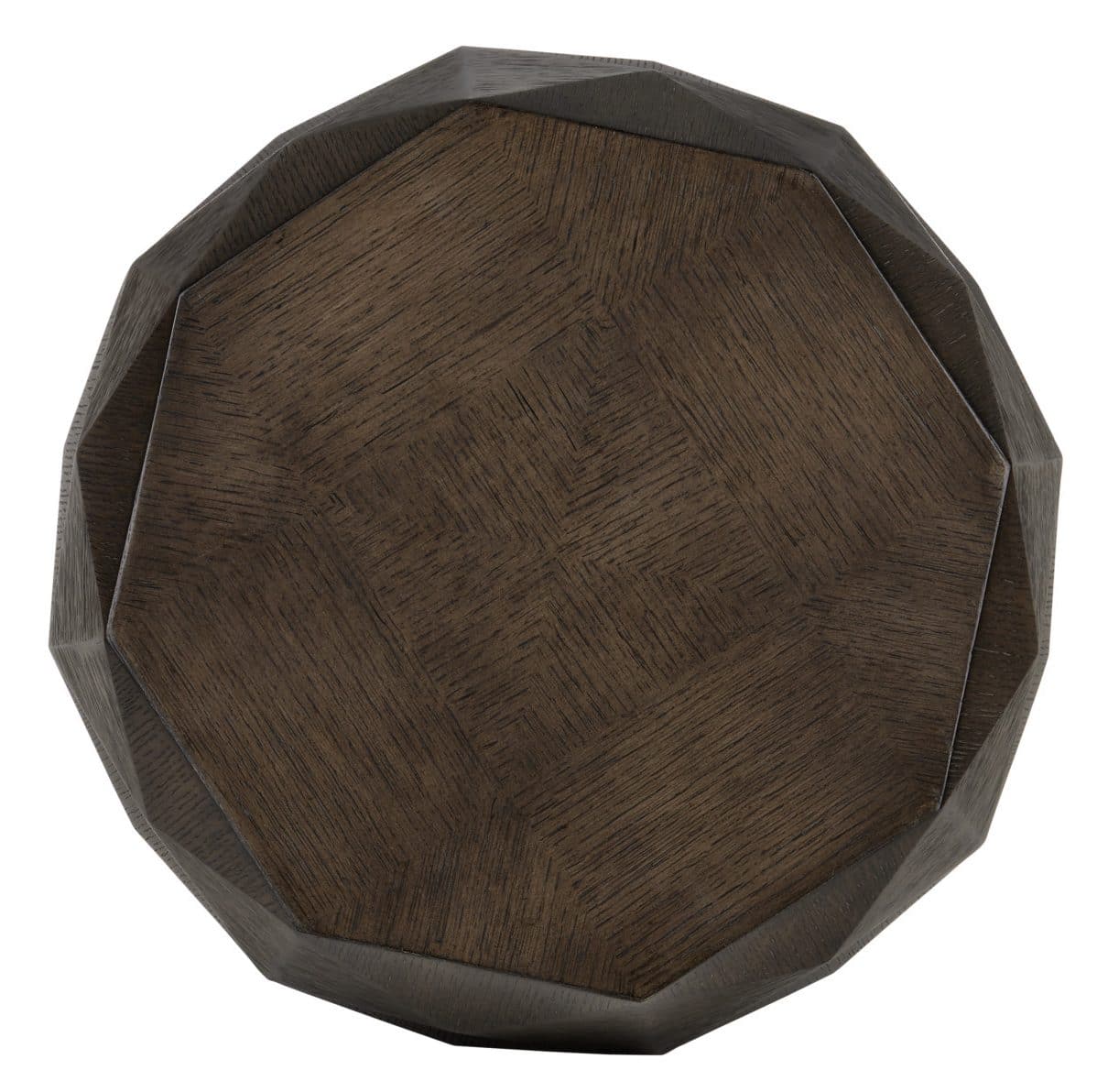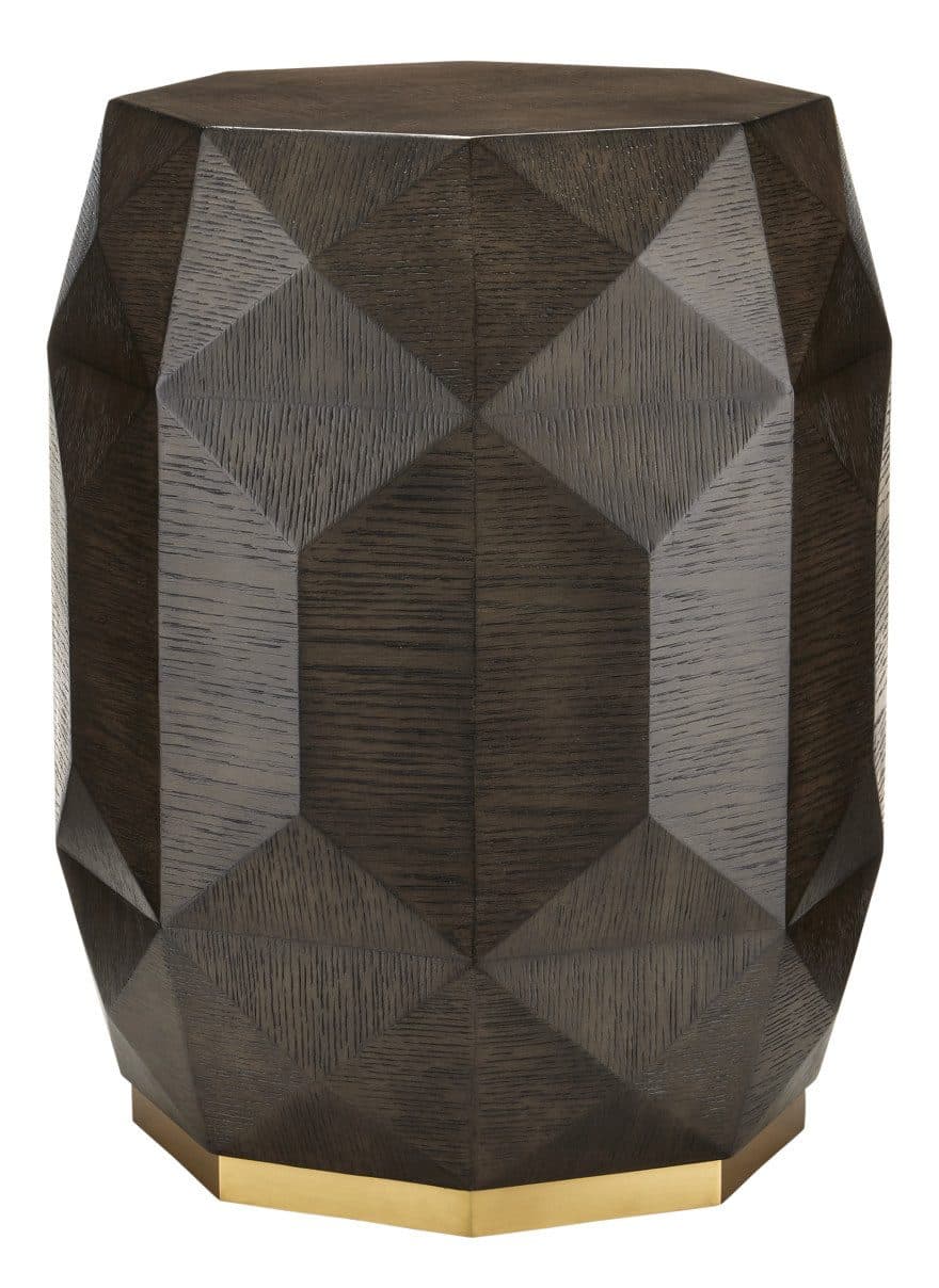 Product Description: Currey and Company 3000-0224 Kendall Dove Gray Accent Table - The Kendall Dove Gray Accent Table has an octagonal shape carved from oak solids covered with facets of oak veneers that make it jewel-like. The surface has a dove gray finish that has been wire-brushed to accentuate the grain in the wood. The dark brown accent table sits on a plinth base made of metal in a polished brass finish to add a glimmering touch to the warmth of the gem-like occasional table.