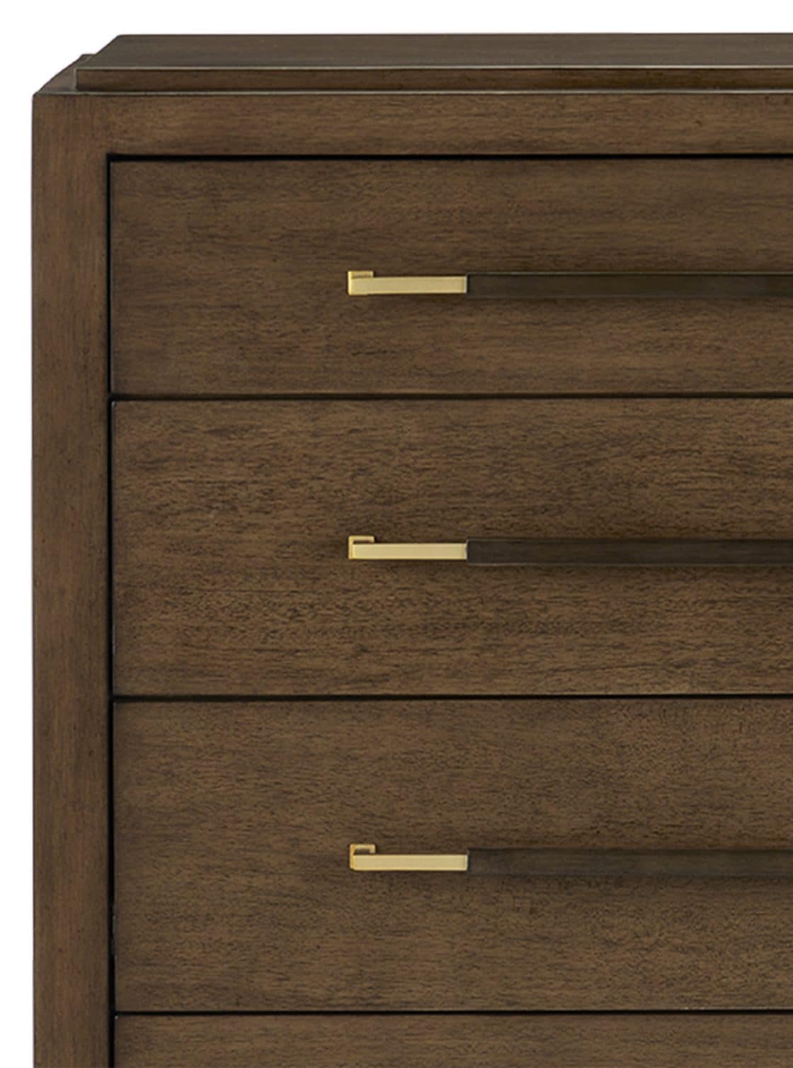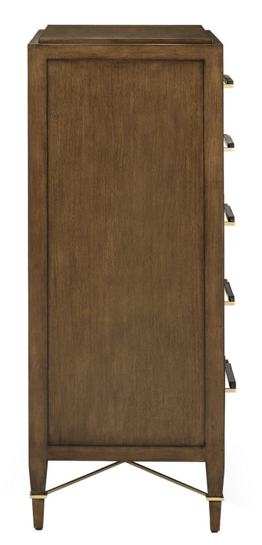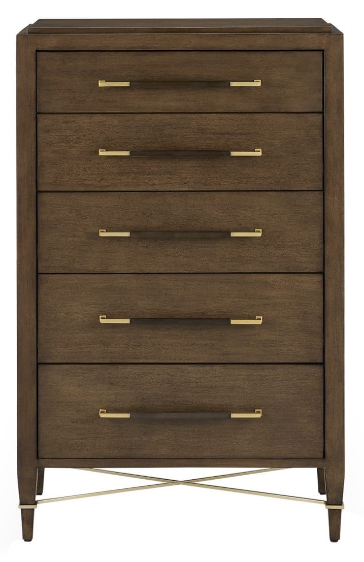 Product Description: Currey and Company 3000-0249 Verona Chanterelle Five-Drawer Chest - The Verona Chanterelle Five-Drawer Chest is warmly handsome covered in brown lacquered linen with metal detailing in a champagne finish. The stretchers on this brown chest create added interest to enhance its flair. The beautifully detailed drawer pulls, which are wrapped in matching material in the middle and left bare on each end, grace each drawer with their metallic sheen. This is a sophisticated touch, as are the squared edges of the hardware that match the straight-edges on the stretchers.