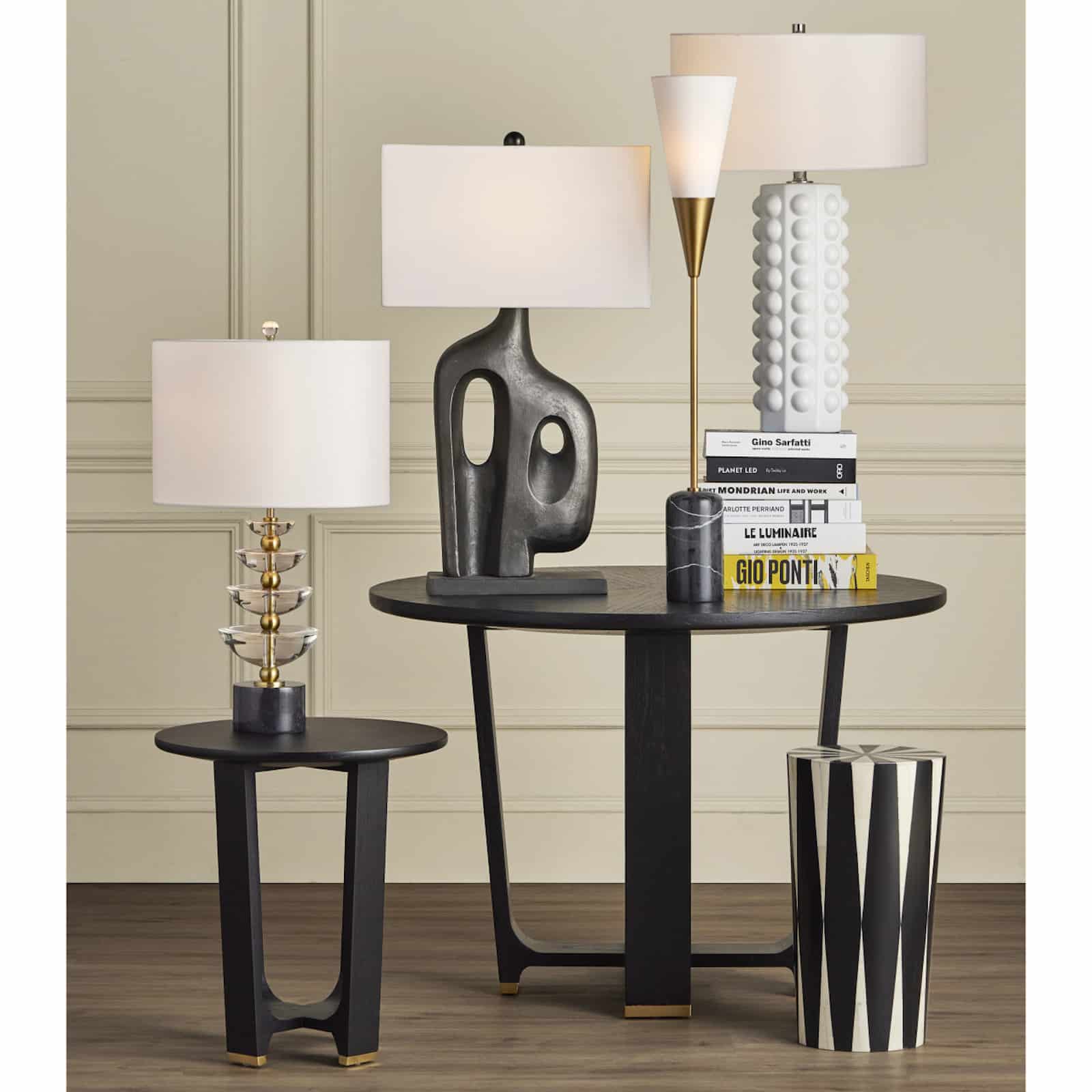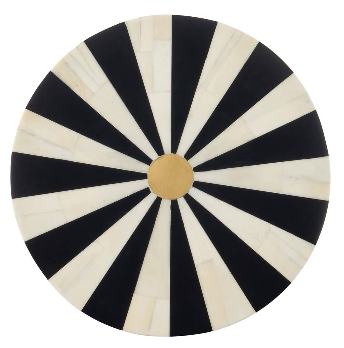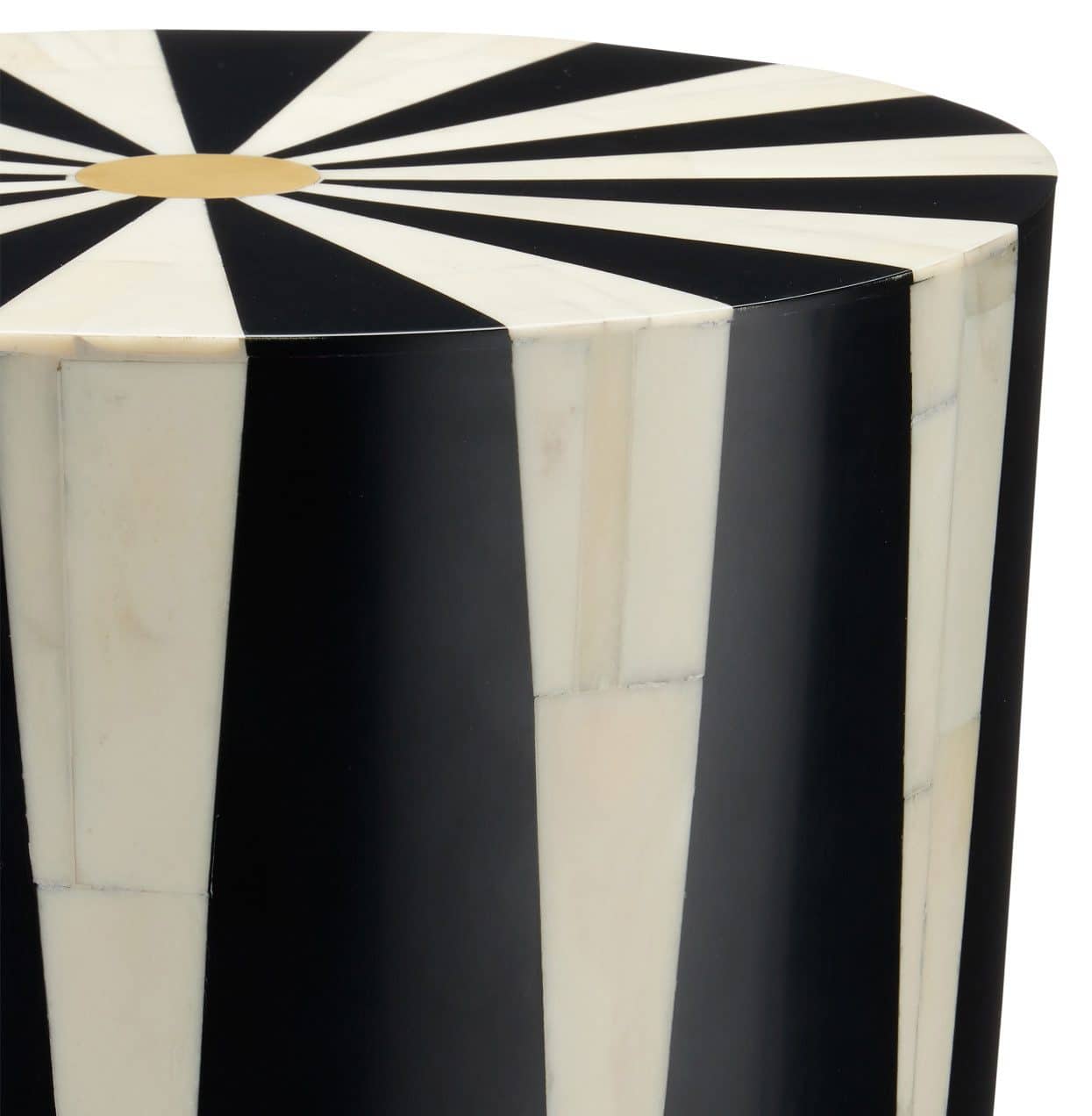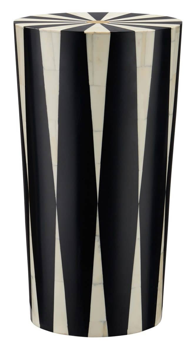 Product Description: Currey and Company 3000-0255 Lenzi Drinks Table - The Lenzi Drinks Table has a strong graphic quality to its pattern that swells and shrinks as the lines move upward. Made of wood wrapped in a bone and composite inlay, the ivory and black table has a center brass detail in the middle of the top. Stylistically, this modern table exudes a hint of Hollywood glamour.
