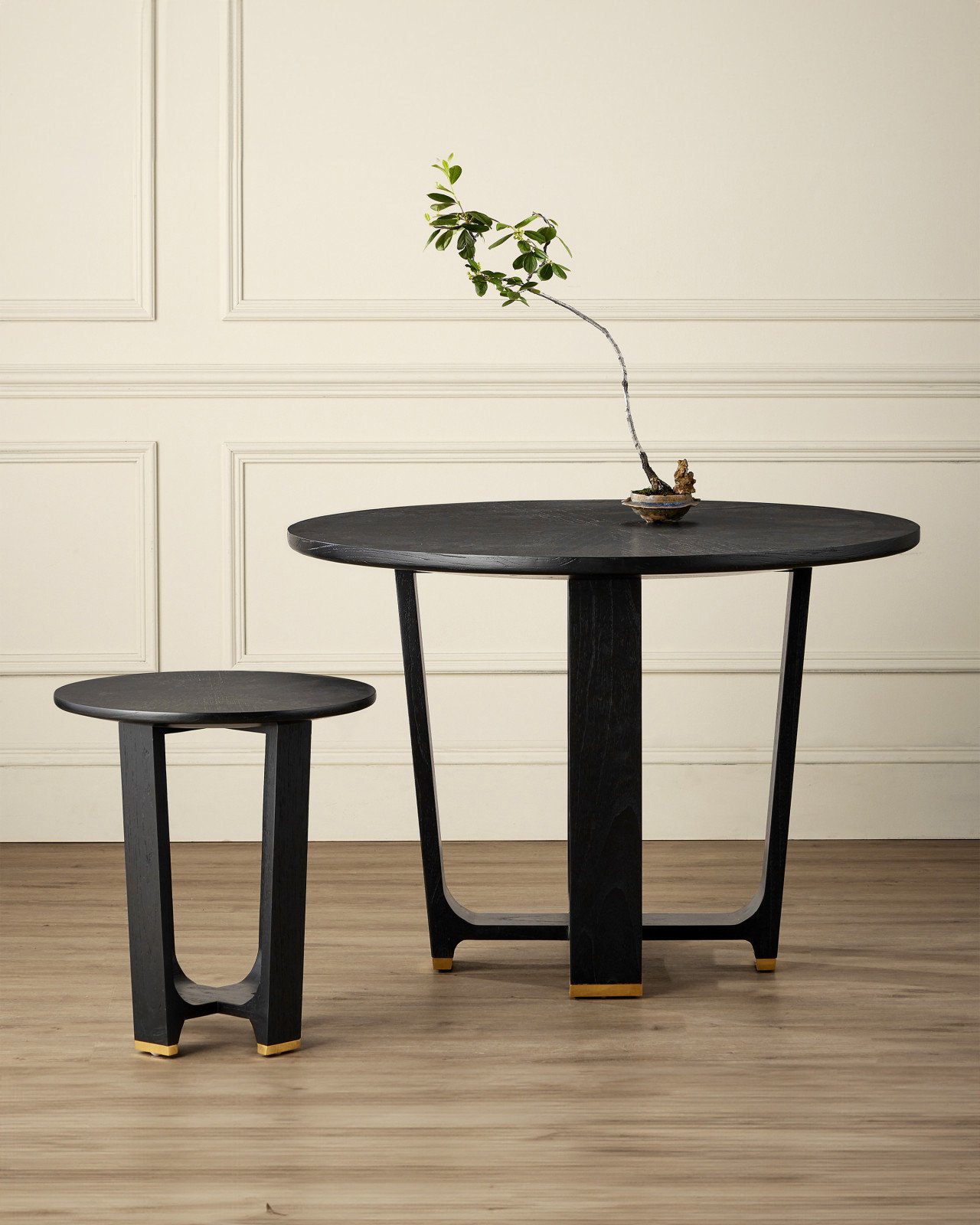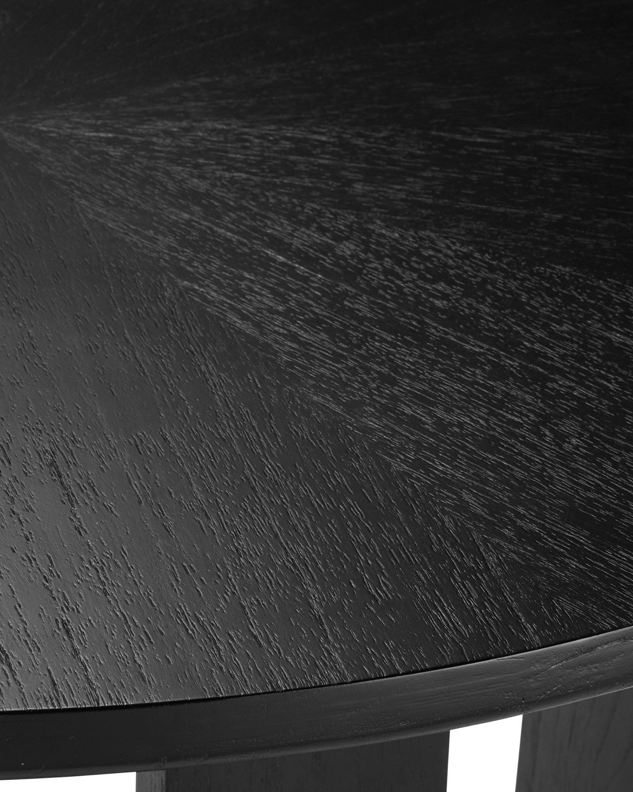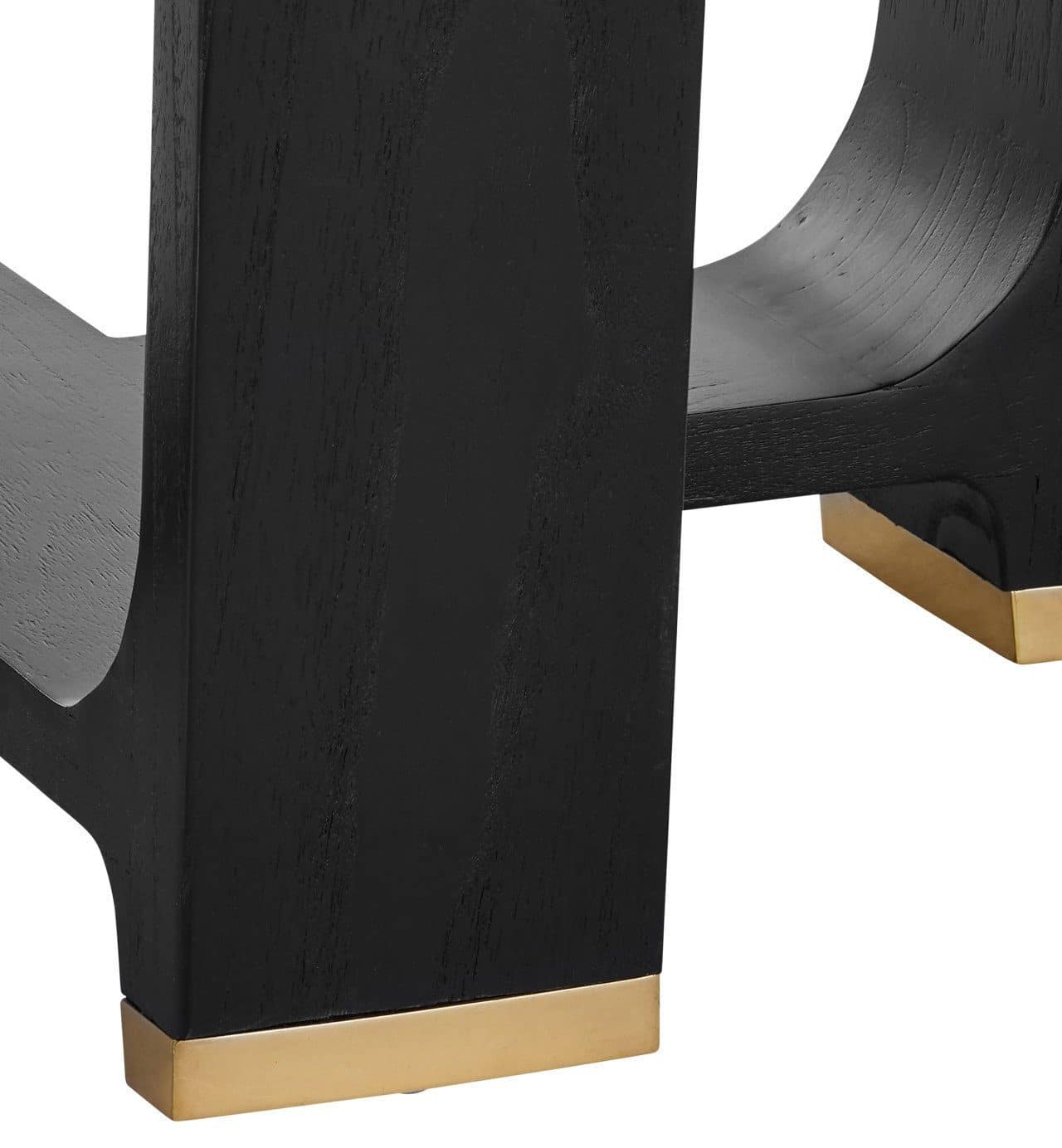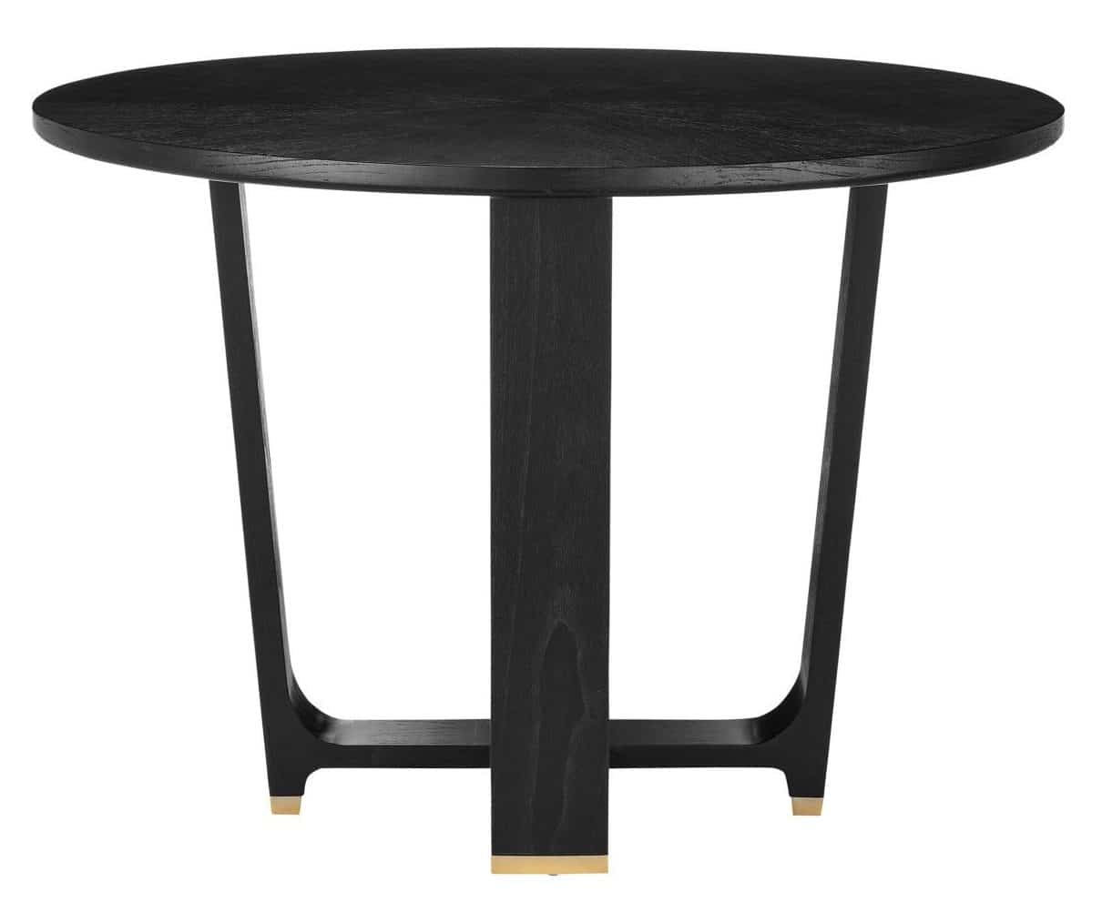Product Description: Currey and Company 3000-0260 Blake Black Dining Table - The Blake Black Dining Table is made of Mindi wood in a matte caviar black finish. The legs that curve up from the bottom hold a round top that has a subtle starburst pattern on the Mindi wood veneer. The feet are capped with polished brass ferrules. Because of its sleek lines, the table is stylistically contemporary.