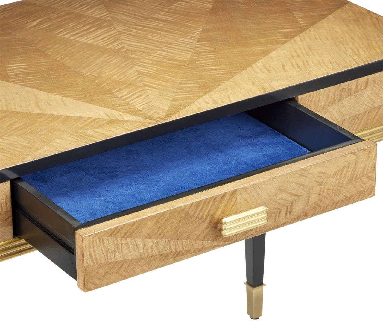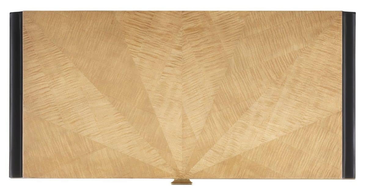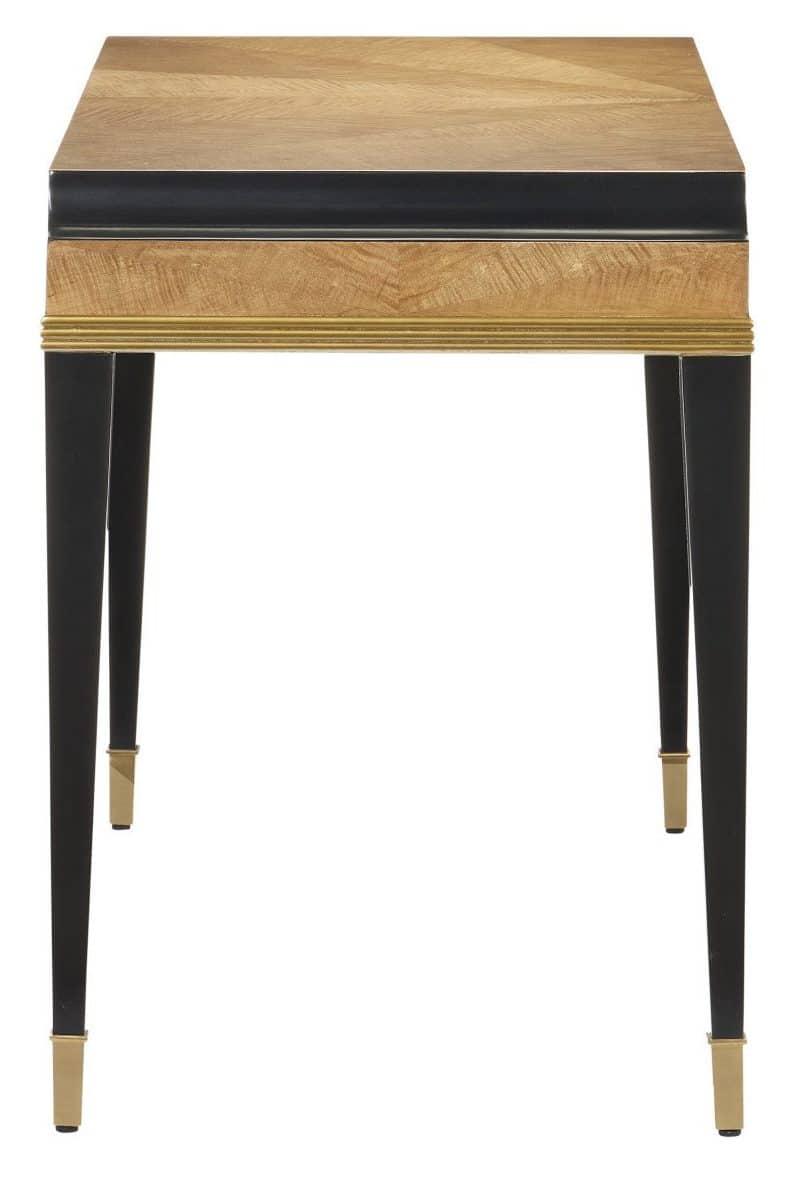 Product Description: Currey and Company 3000-0272 Kallista Writing Desk - The Kallista Writing Desk has a taupe finish that enlivens the figured sycamore veneers, the wood grains bringing the desk a hint of distressing that contrasts the rich black elements. The drawer-pull, ferrules and linear accent that wraps the desktop where it meets the legs are in a polished brass finish. Specialty treatments on this artful tan desk include wood drawer slides and a radial starburst pattern on the veneers.