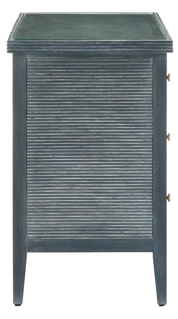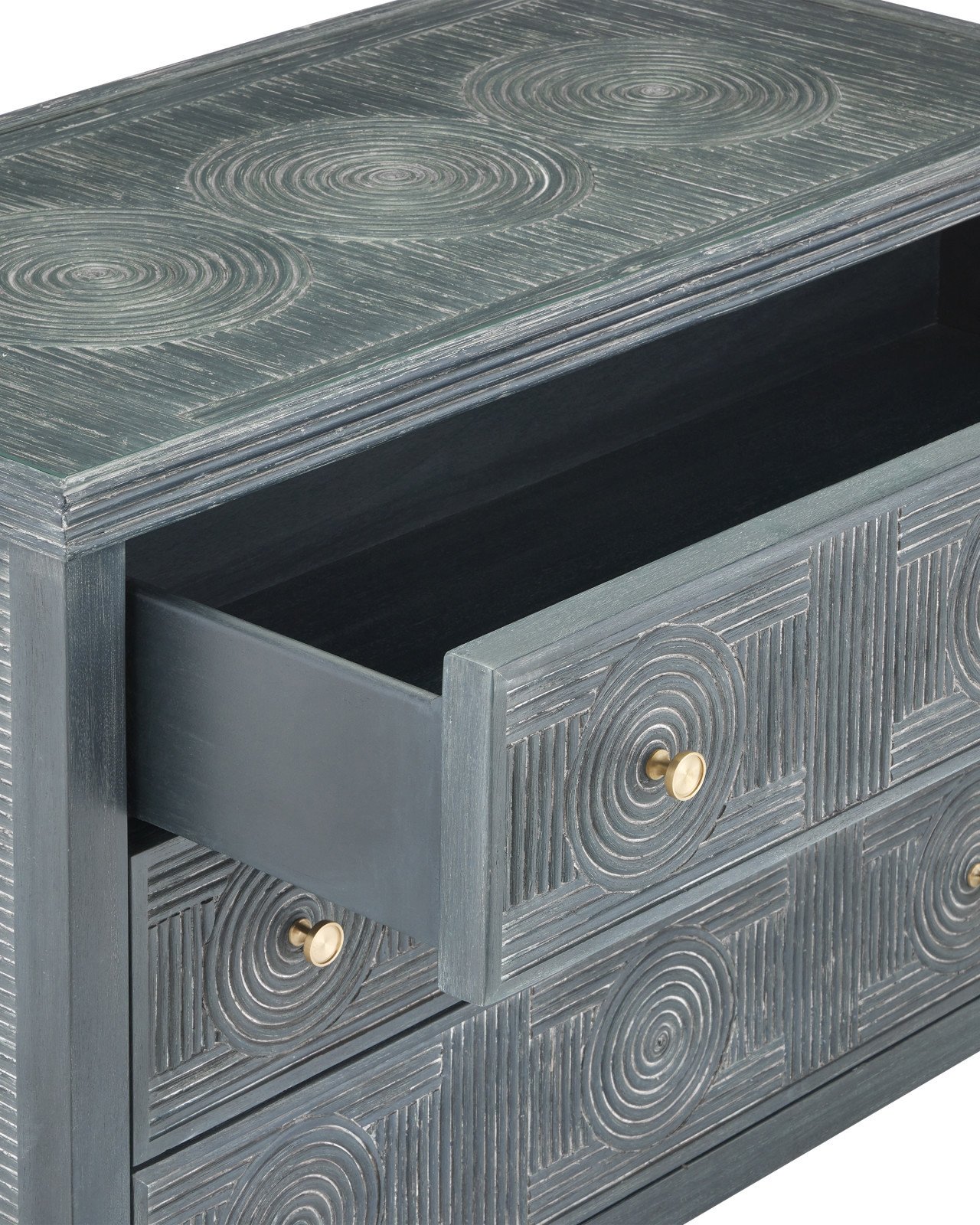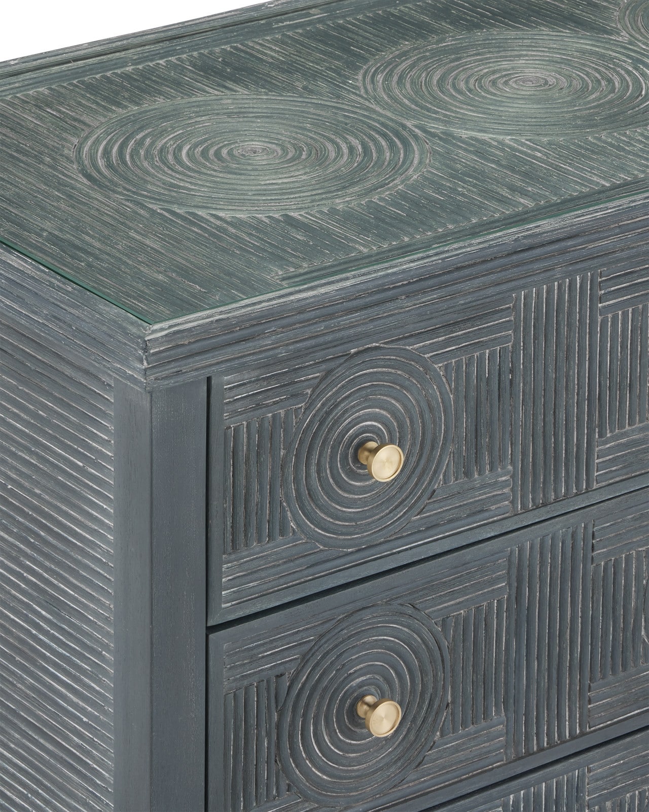 Product Description: Currey and Company 3000-0291 Santos Vintage Navy Large Chest - The Santos Vintage Navy Large Chest has a split rattan pattern on the drawers, sides, and top, which is made by hand and applied to a solid mahogany frame before the entire piece is covered in a vintage navy finish. A design detail of note is how the brass pulls in a brushed brass finish sit squarely in the center of the circles created by the pattern. This navy blue chest has solid mahogany dovetail drawer boxes, soft-close drawer slides, and adjustable glides.