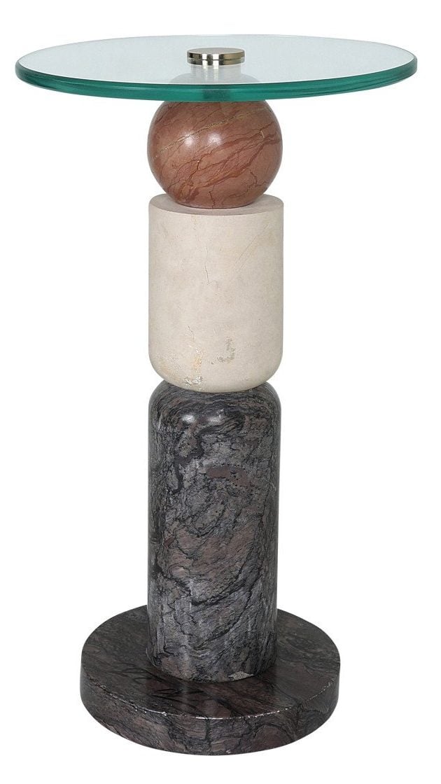 Product Description: Currey and Company 3000-0309 Moreno Drinks Table - The Moreno Drinks Table is made of Rosa Cappuccino Marble, Camello Neve Marble, and Breccia Marble. The geometric sculptural piece has tremendous personality because of the veining of the marbles. The surfaces of the table will vary from piece to piece given it is made of natural stone. The Moreno has a glass top with double bevels.