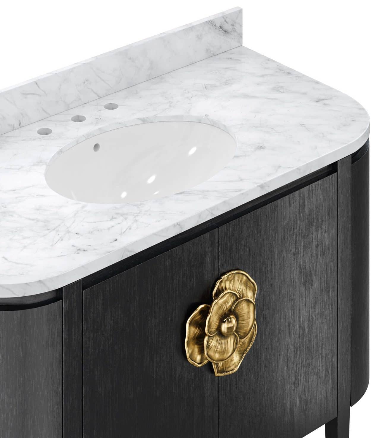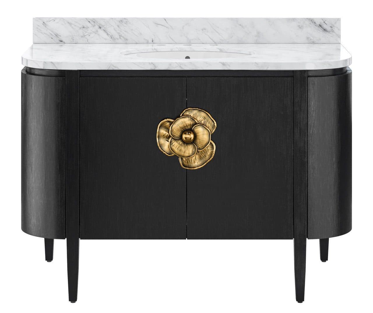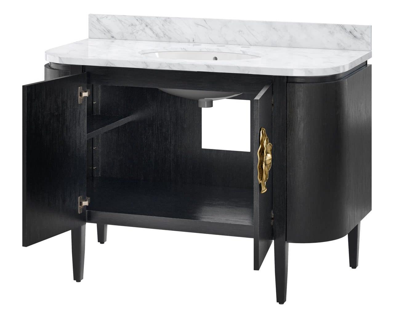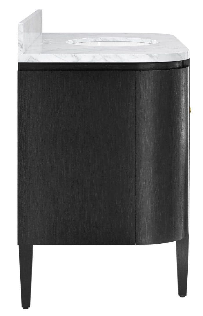 Product Description: Currey and Company 3800-0001 Briallen 48 inch Black Vanity with Oval Undermount Sink - The Briallen 48" Black Vanity with Undermount Sink brings an elegant and sophisticated vibe to a designer bathroom or powder room. This new freestanding vanity, inspired by our longtime best-selling cabinet, is made of white oak solids and veneers, with a white Carrara marble top and backsplash, and our signature cast brass door pull. The pre-installed oval porcelain sink is by TOTO.