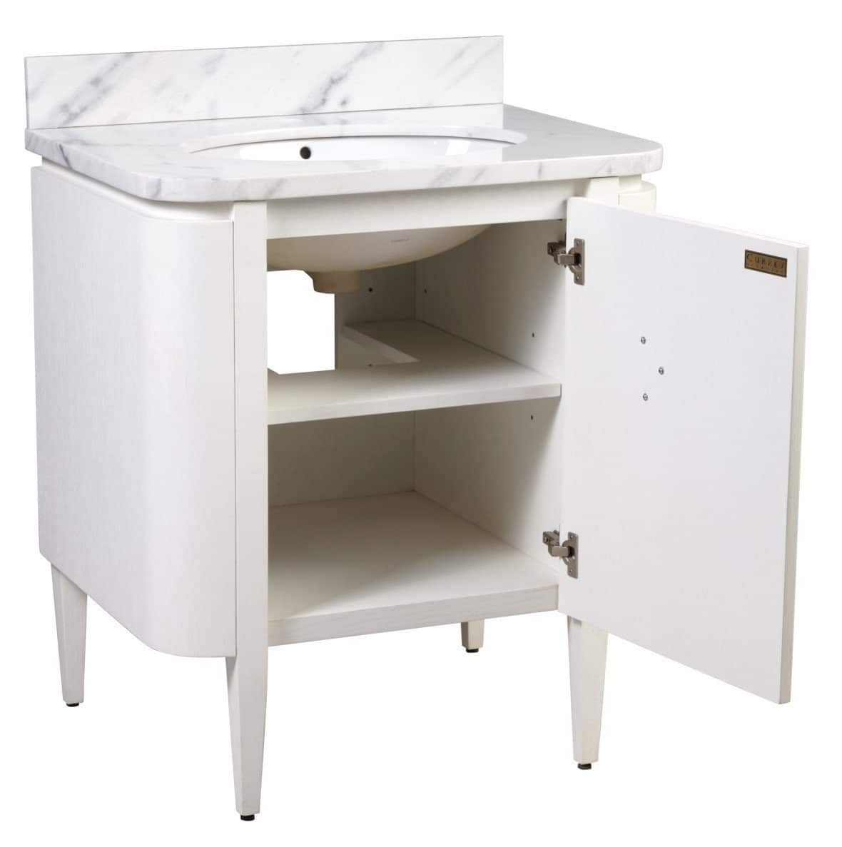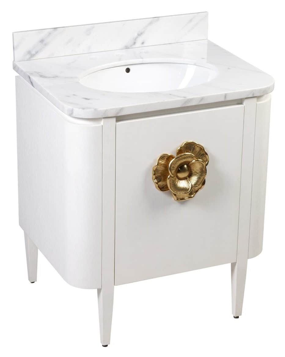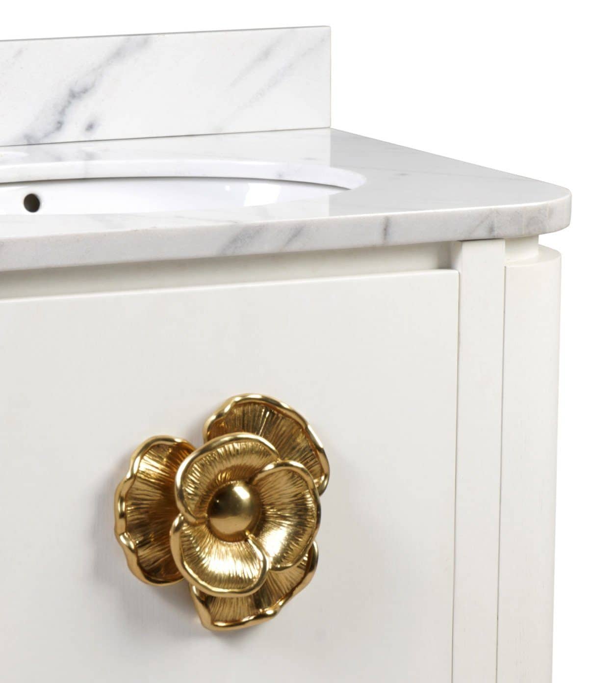 Product Description: Currey and Company 3800-0004 Briallen 30 inch White Vanity with Oval Undermount Sink - The impressively sized brass flower pull on the Briallen 30" White Vanity is a stunning ornamentation that contrasts the cerused white finish. The interior has one adjustable shelf and there is an optional wood tray that attaches to the inside of the door. The white Carrara marble top is fitted with a white oval undermount sink. Other fine design attributes include soft-close door hinges and a matching marble backsplash.