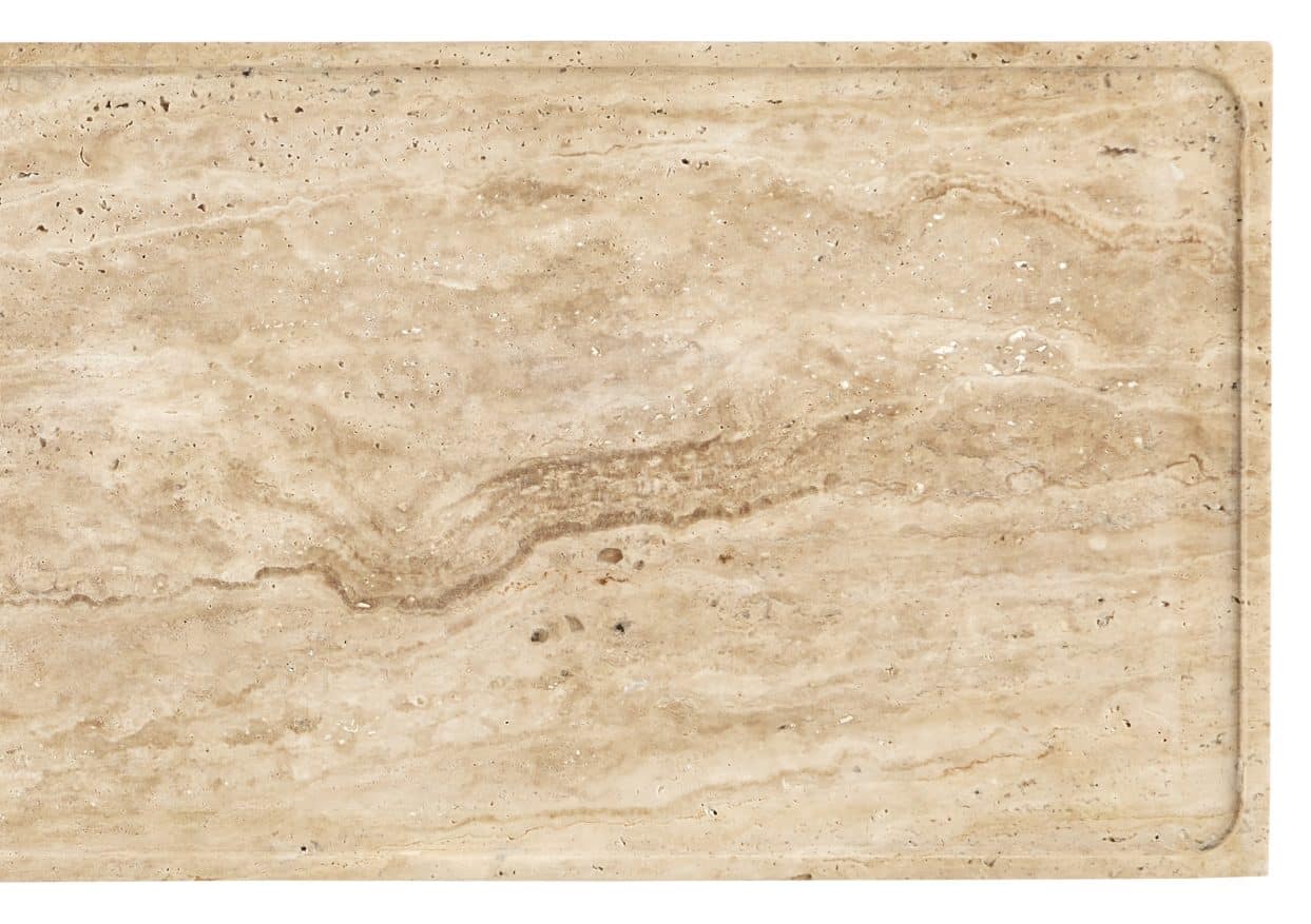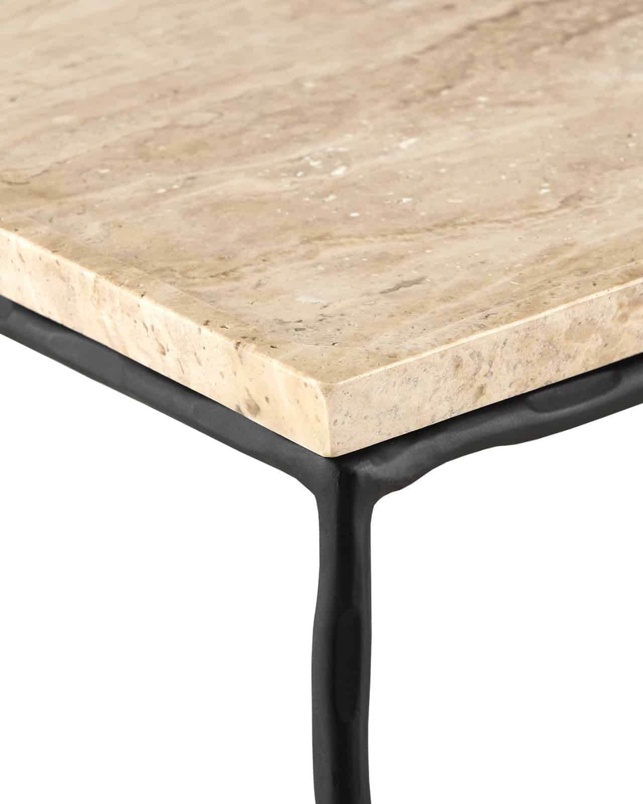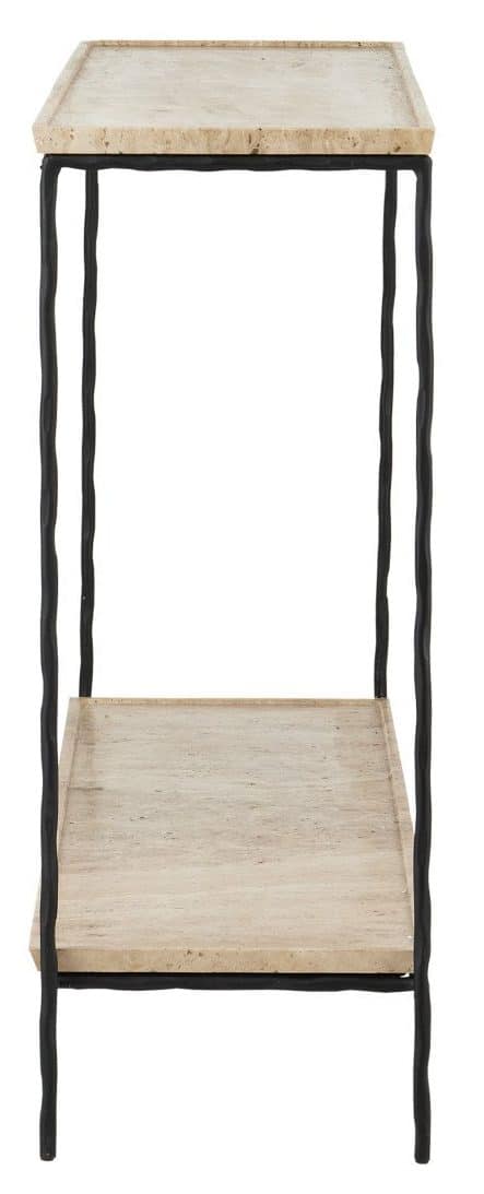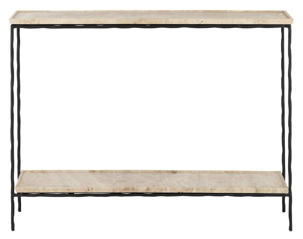 Product Description: Currey and Company 4000-0137 Boyles Travertine Console Table - The Boyles Travertine Console Table has a forged iron base in a black finish that holds a tray top made of solid, unpolished travertine. The personality of the surface stems from the fact that it is porous and has a variety of nooks and crannies in its pitting. Inherent variations in the stone's texture, veining, and color - from pale ivory to a warm tan - are to be expected and celebrated. Each surface is unique so no two are exactly alike.