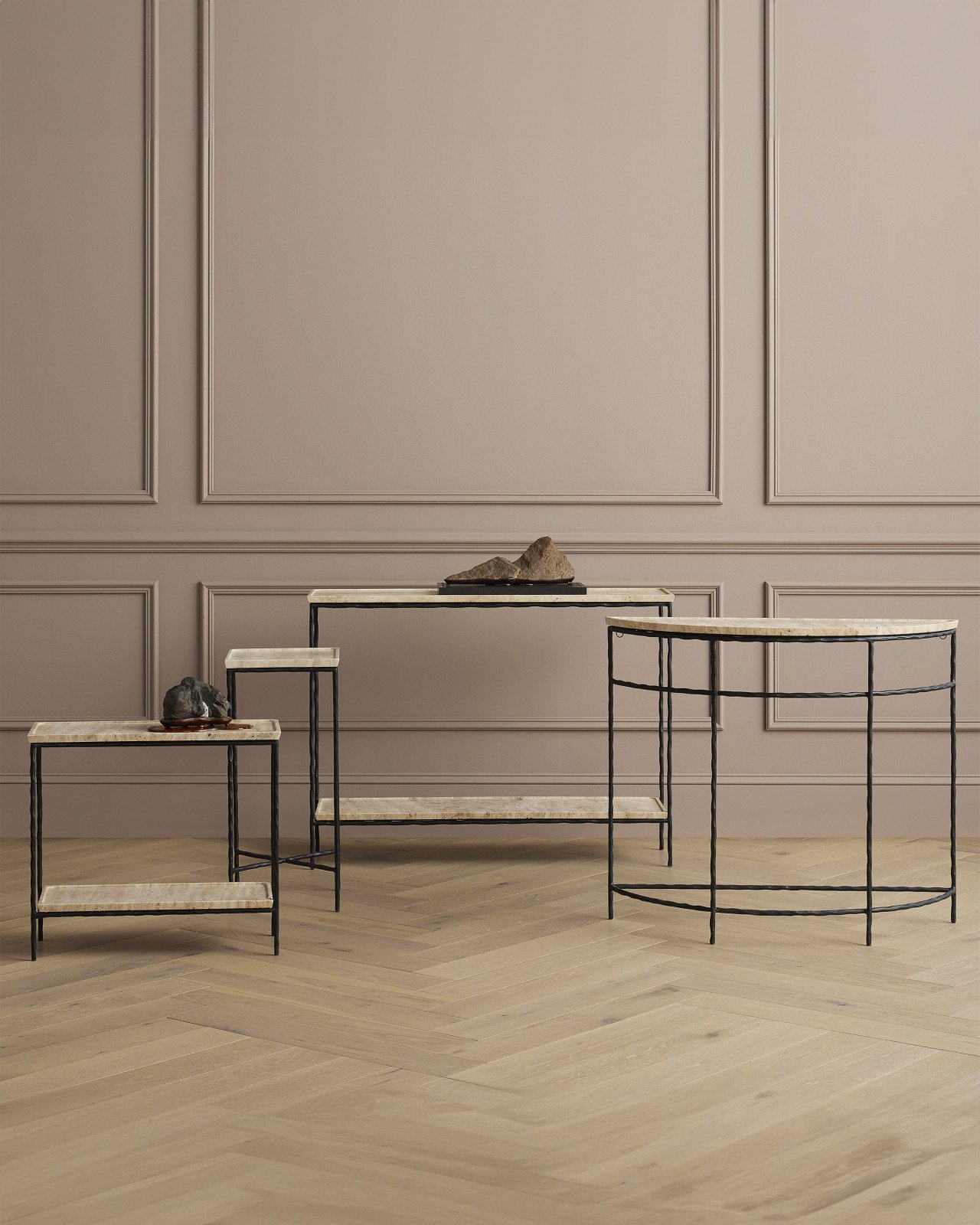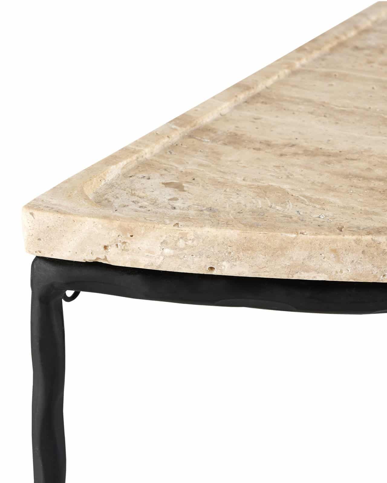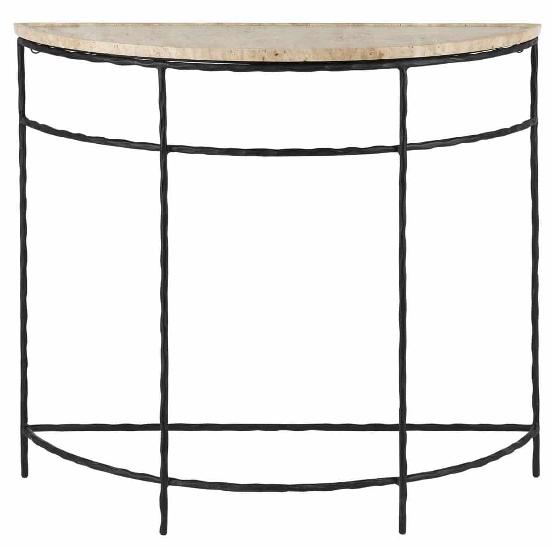 Product Description: Currey and Company 4000-0138 Boyles Travertine Demi-Lune Table - The Boyles Travertine Demi-Lune Table has a forged iron base in a black finish that holds a tray top made of solid, unpolished travertine. The personality of the surface stems from the fact that it is porous and has a variety of nooks and crannies in its pitting. Inherent variations in the stone's texture, veining, and color - from pale ivory to a warm tan - are to be expected and celebrated. Each surface is unique so no two are exactly alike.