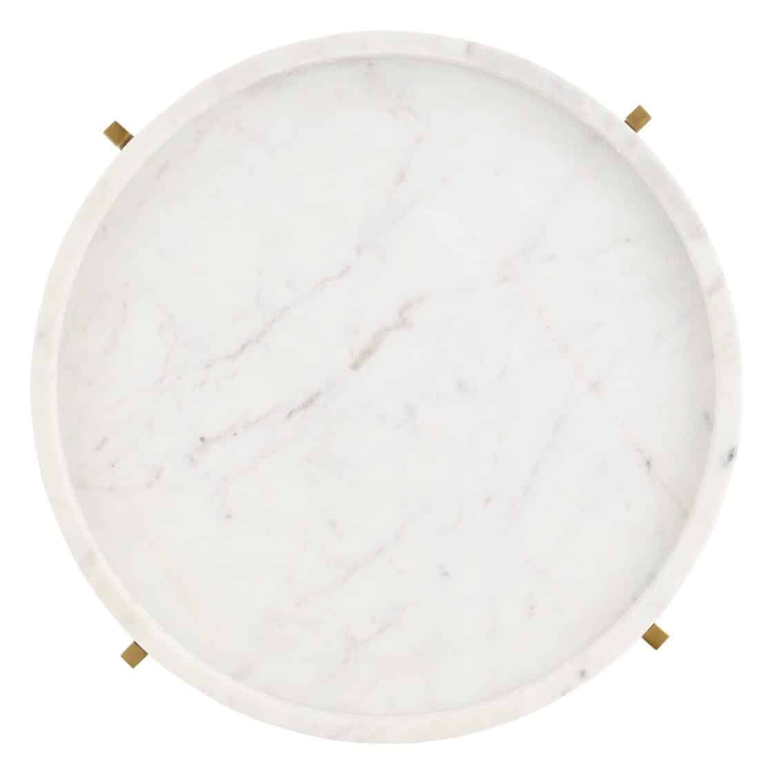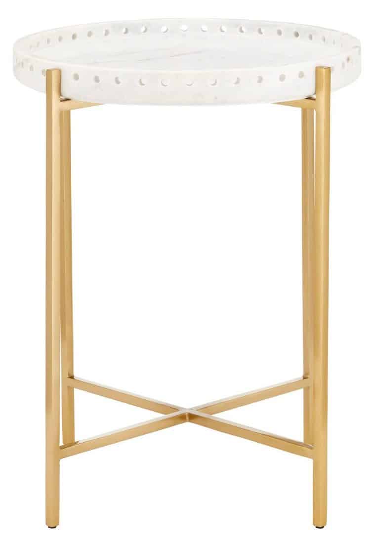 Product Description: Currey and Company 4000-0146 Freya Marble Accent Table - The tray top of the Freya Marble Accent Table is created by an engineering feat, as the white decorative disc is cut on a CNC machine that carves out the interior and drills the holes that ornament the circumference of the top. An artisanal aspect to the design is the uniformity of the thickness of the sides and the regular spacing of the holes, both of which require refined handicraft skills. The beauty of real stone is evident here, as the subtle veining brings elegance to this white and gold occasional table.