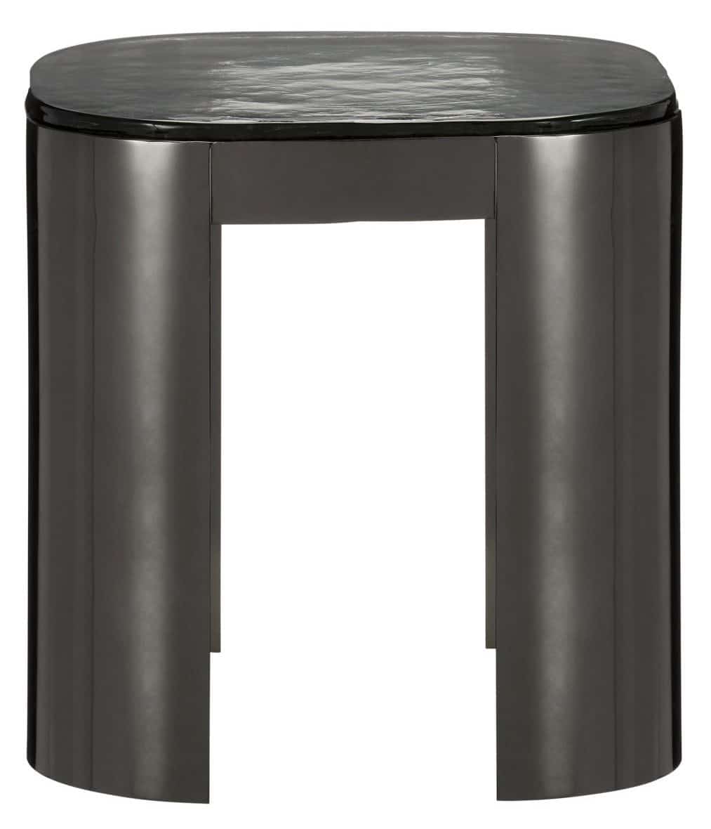 Product Description: Currey and Company 4000-0160 Sev Graphite Accent Table - At the top of the mod-squad list, the Sev Graphite Accent Table has a shape that looks back to the past but with forward-thinking finishing techniques. The stainless steel table with a contemporary shape is mirrored so it reads like it has a black nickel -- or graphite -- finish. The clear cast-glass top sits proud so it will always stay in place.