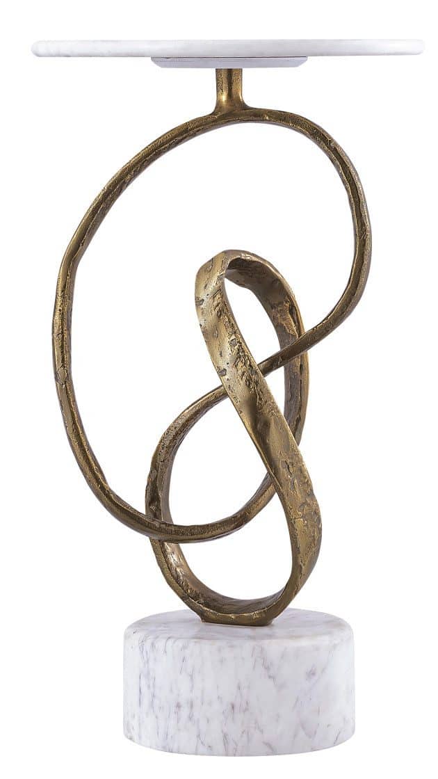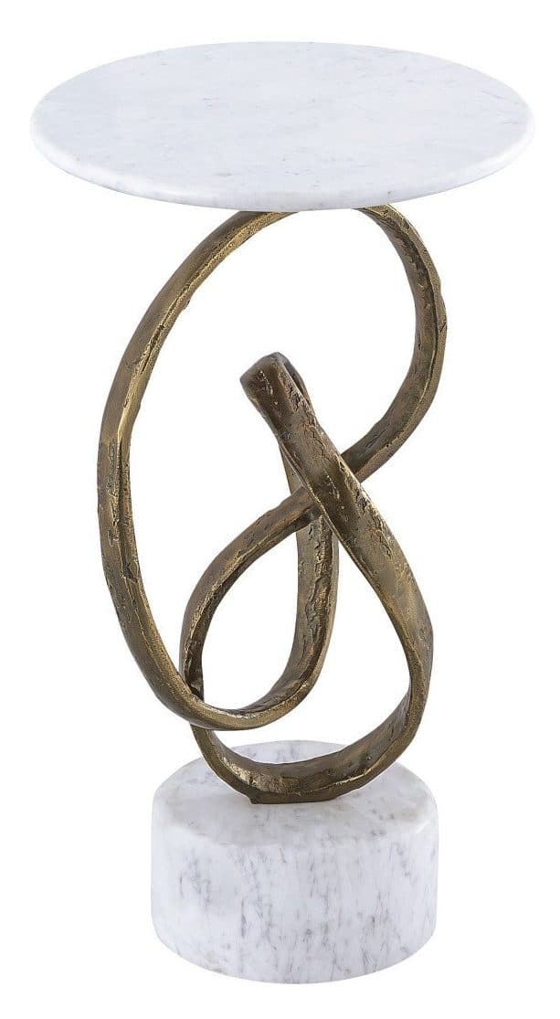Product Description: Currey and Company 4000-0196 Ruban Accent Table - The masculine design of the Ruban Accent Table has a number of special attributes that include the rough luxe feel of the curling metal ribbon, and the contrasting white marble base and top. The ribbon, which is made of cast aluminum in an antique brass finish, rises from the stone base to hold the thin white top in place. The natural veining in the stone will make each piece unique.