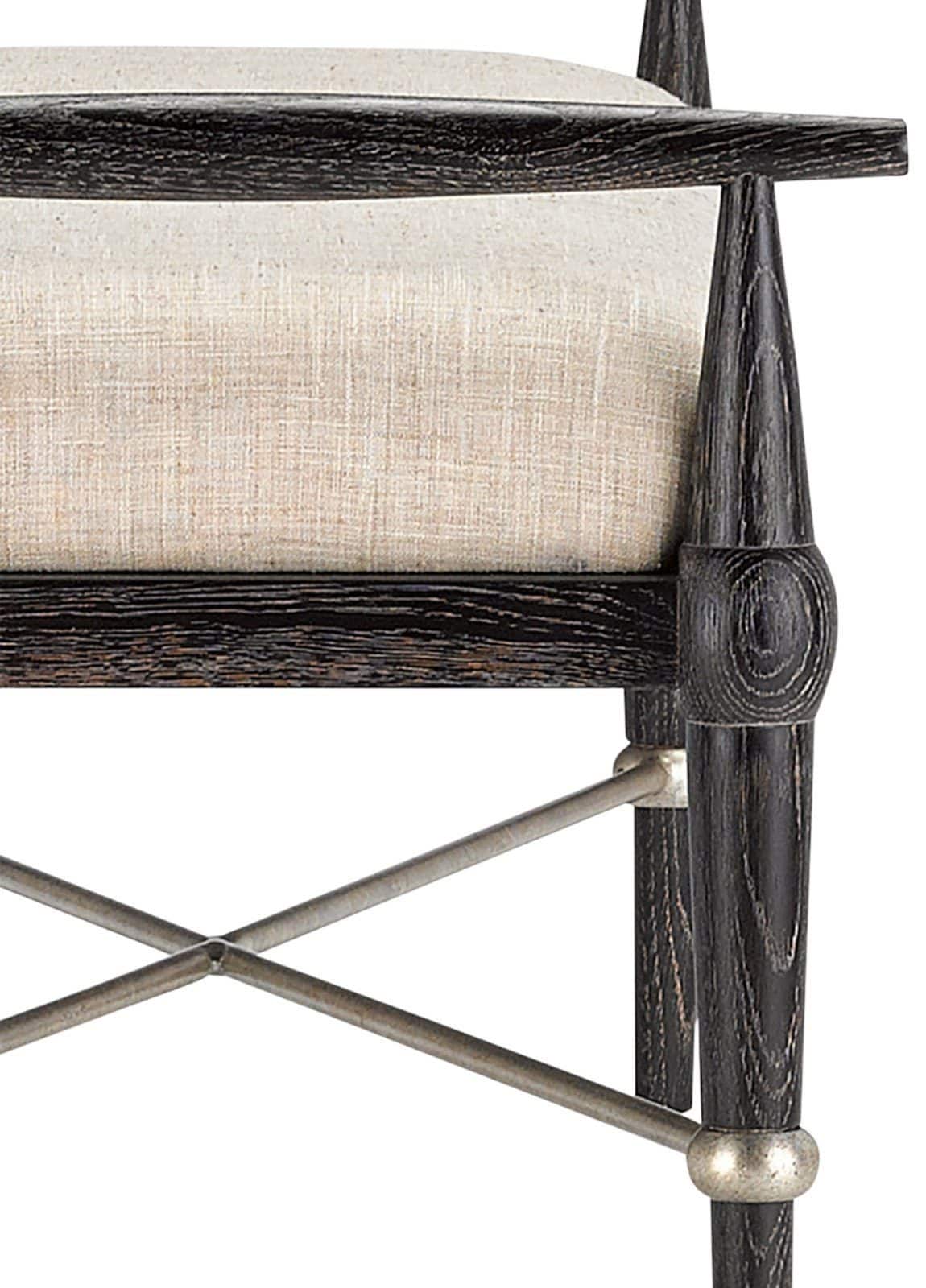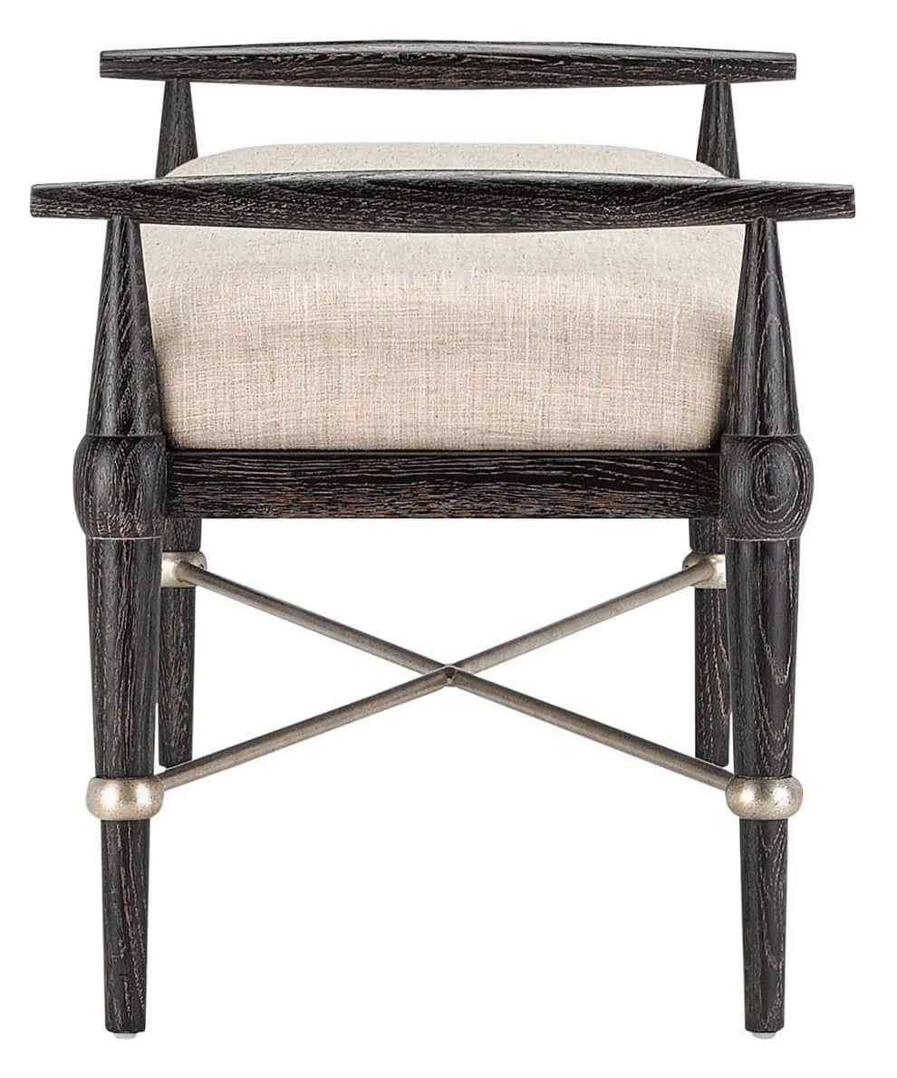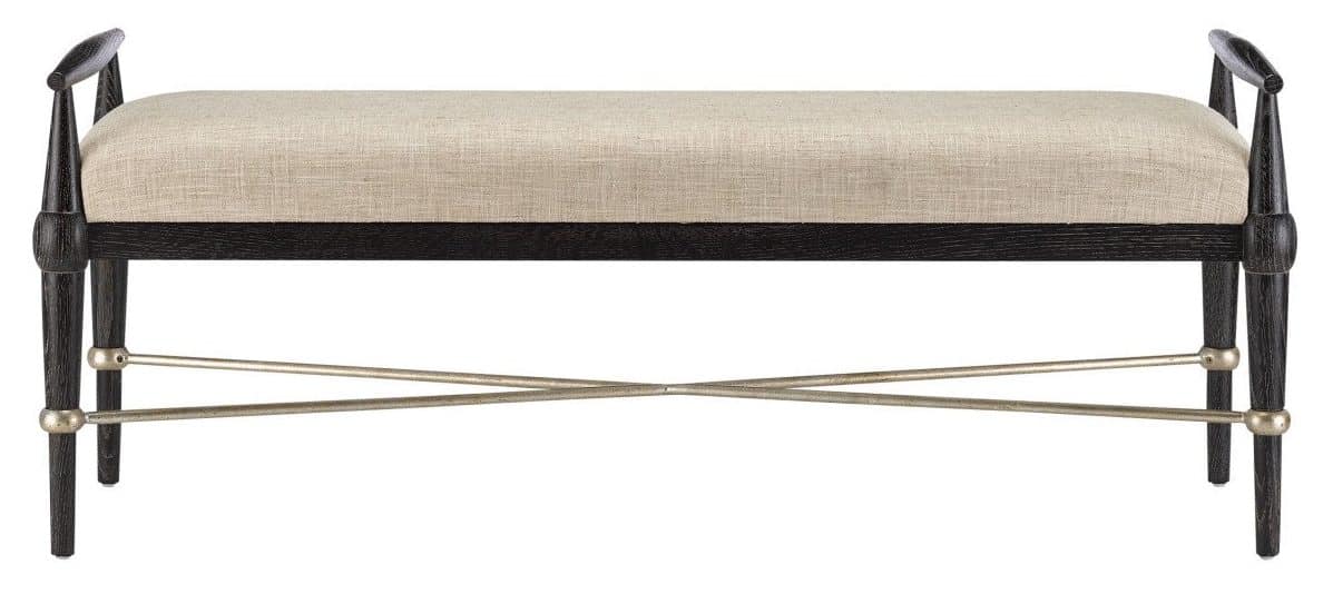 Product Description: Currey and Company 7000-0052 Perrin Black Bench Finn Natural - The Perrin Black Bench is a take on mid-century modern but with a slight transitional twist. Made of oak in an ebonized taupe finish, the dark brown bench is ornamented with iron stretchers in a silver Granello finish. It is upholstered in Finn Natural fabric, which is made of 100 percent polyester.